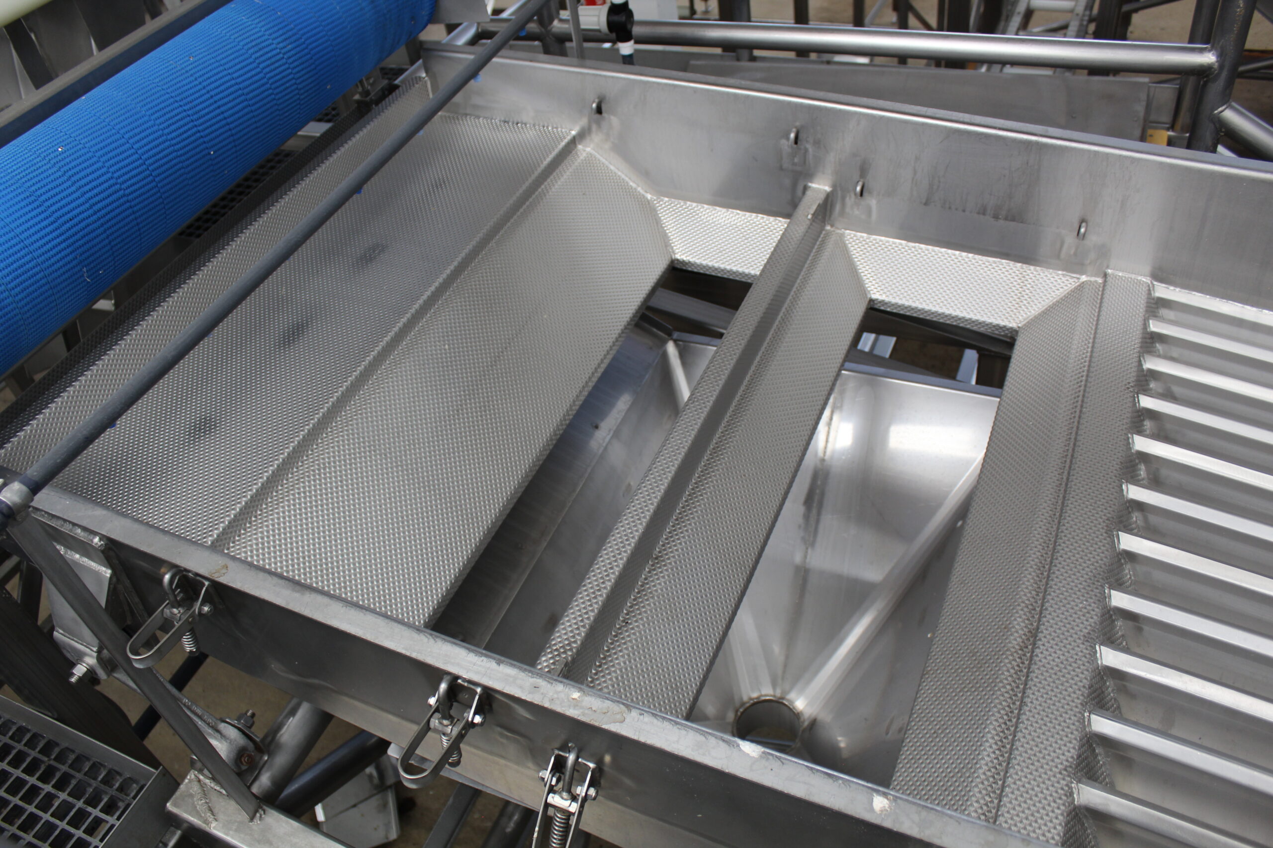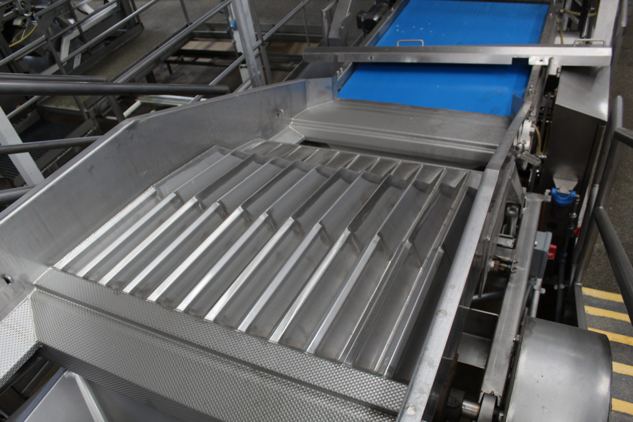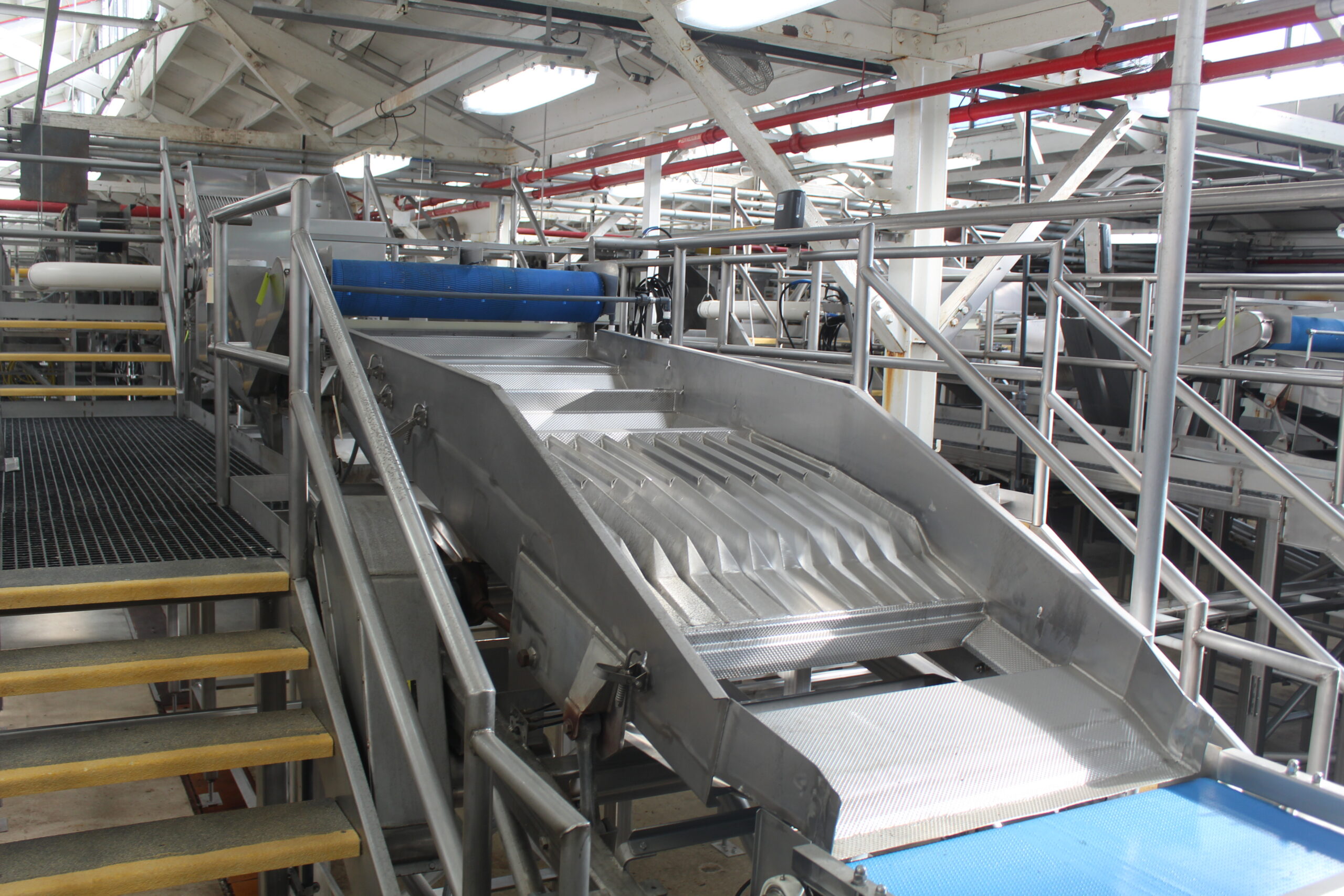 Shaker was last orienting halved pear slices face up, feeding into a sorter. Line 3 of 4