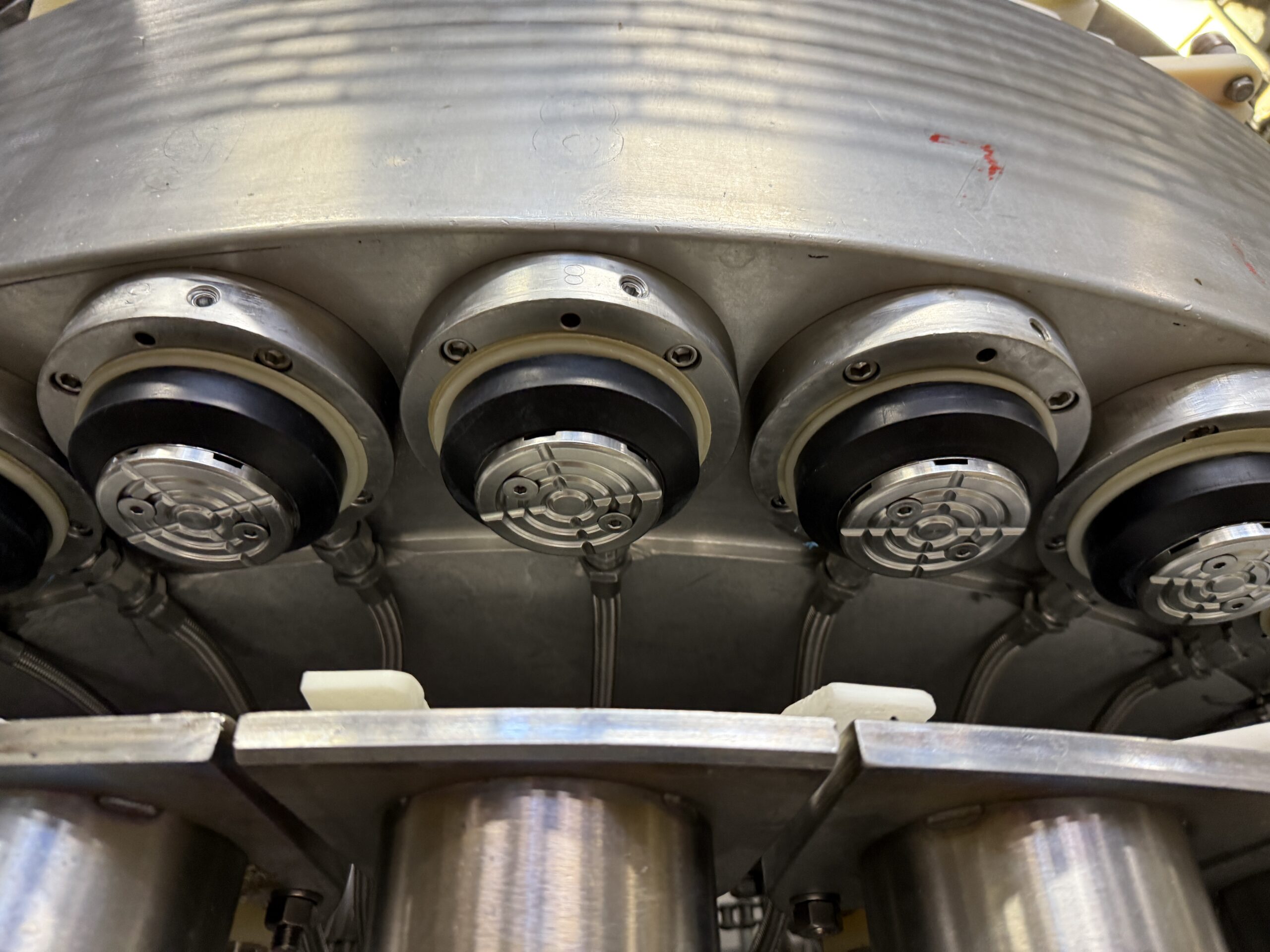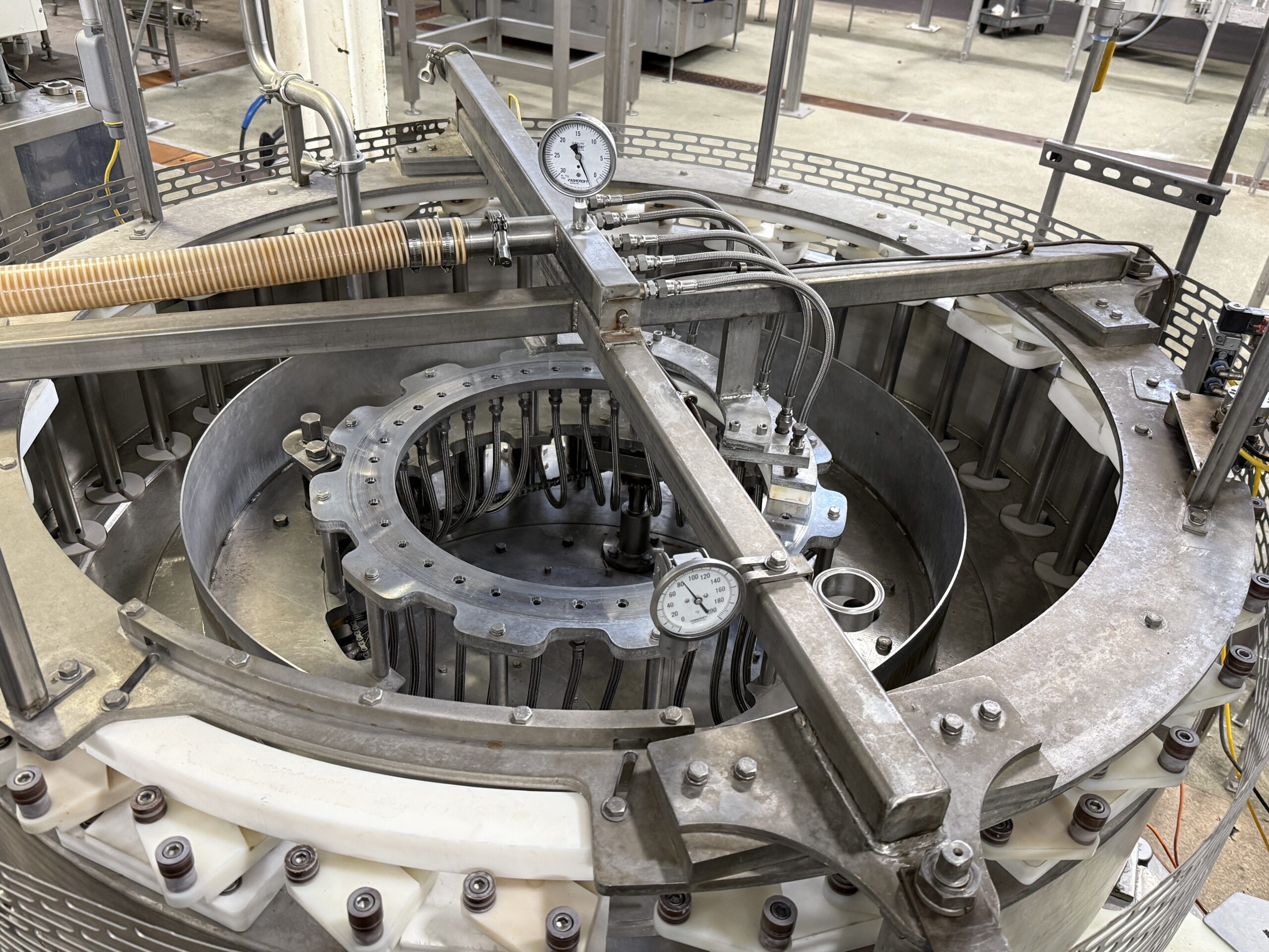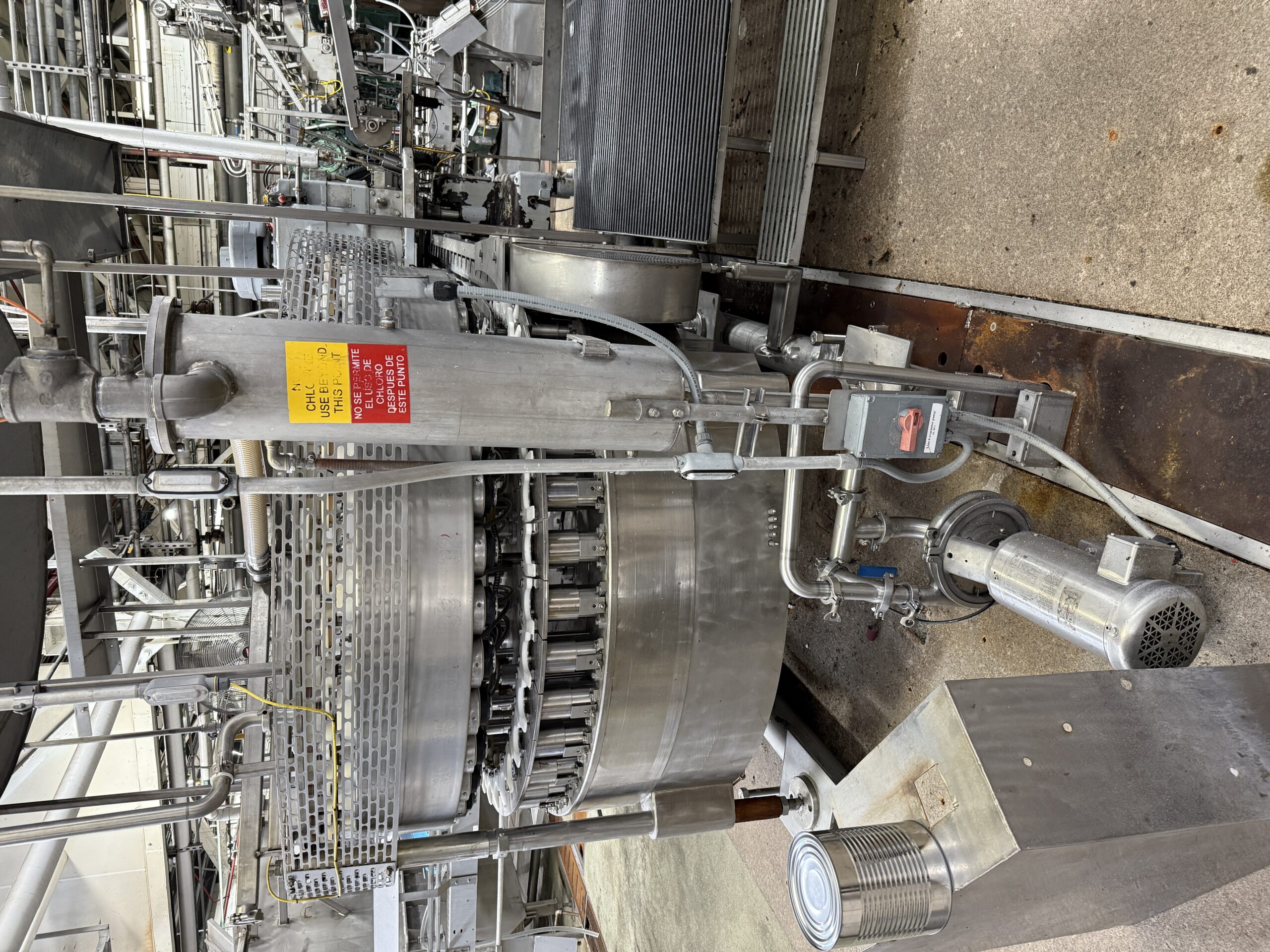 36 Pocket Zacmi syruper feeds filled cans into an Angelus Seamer