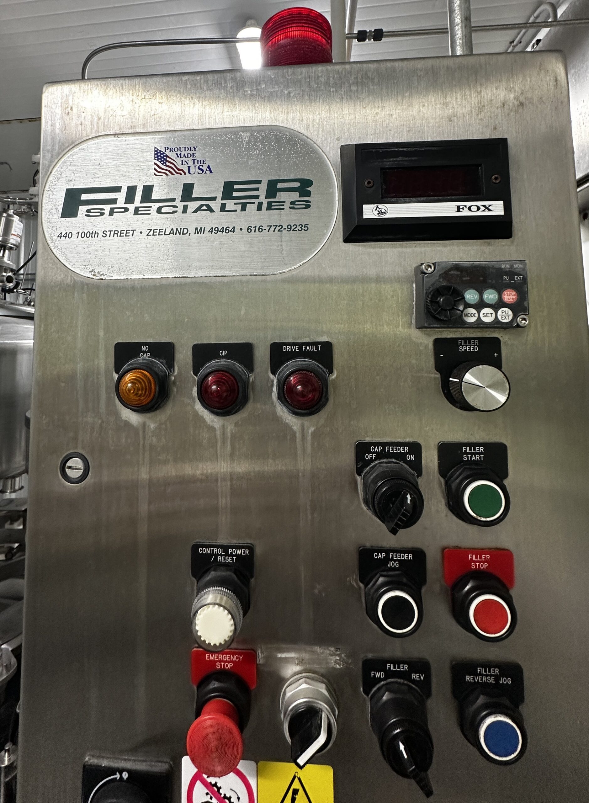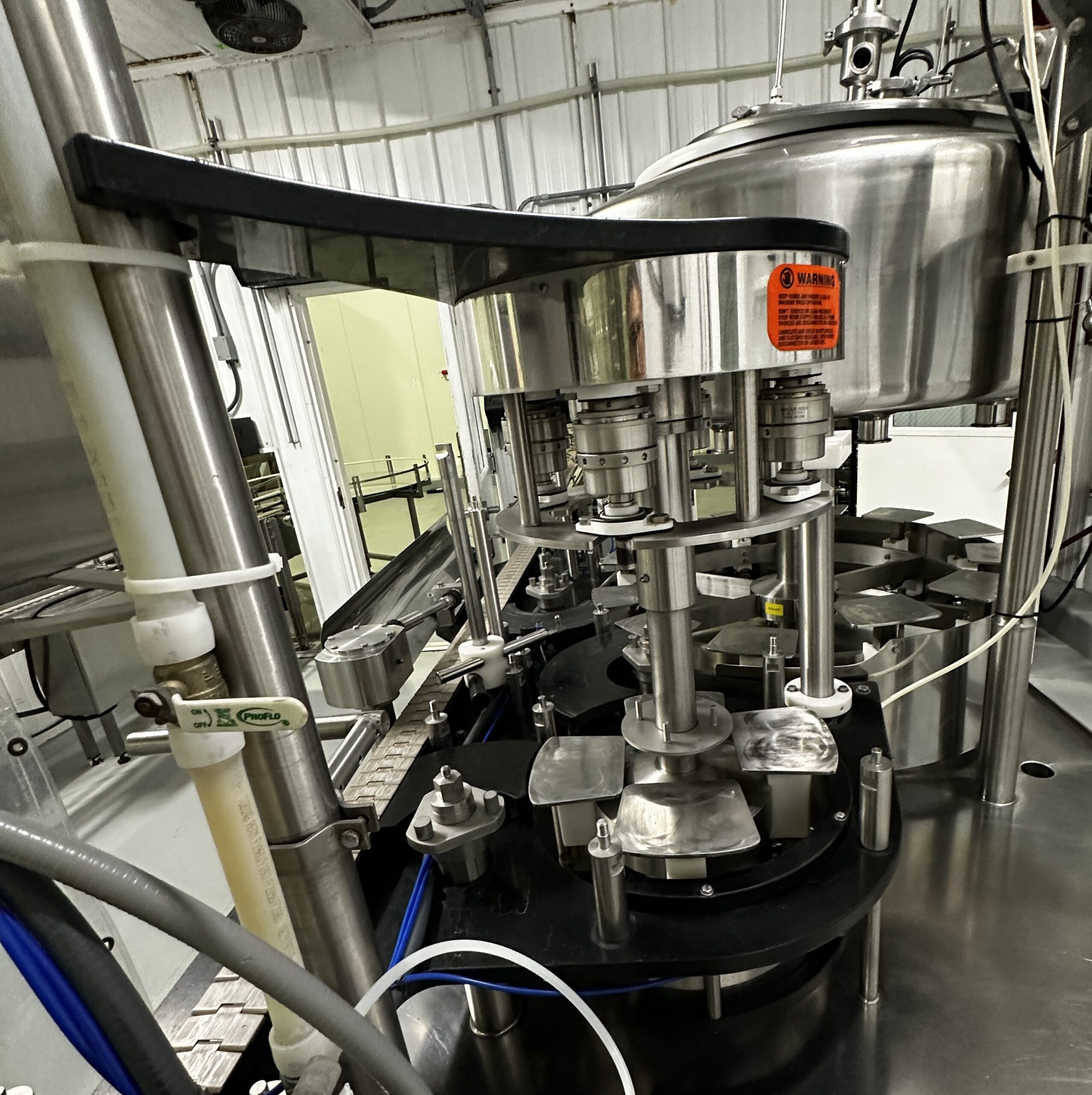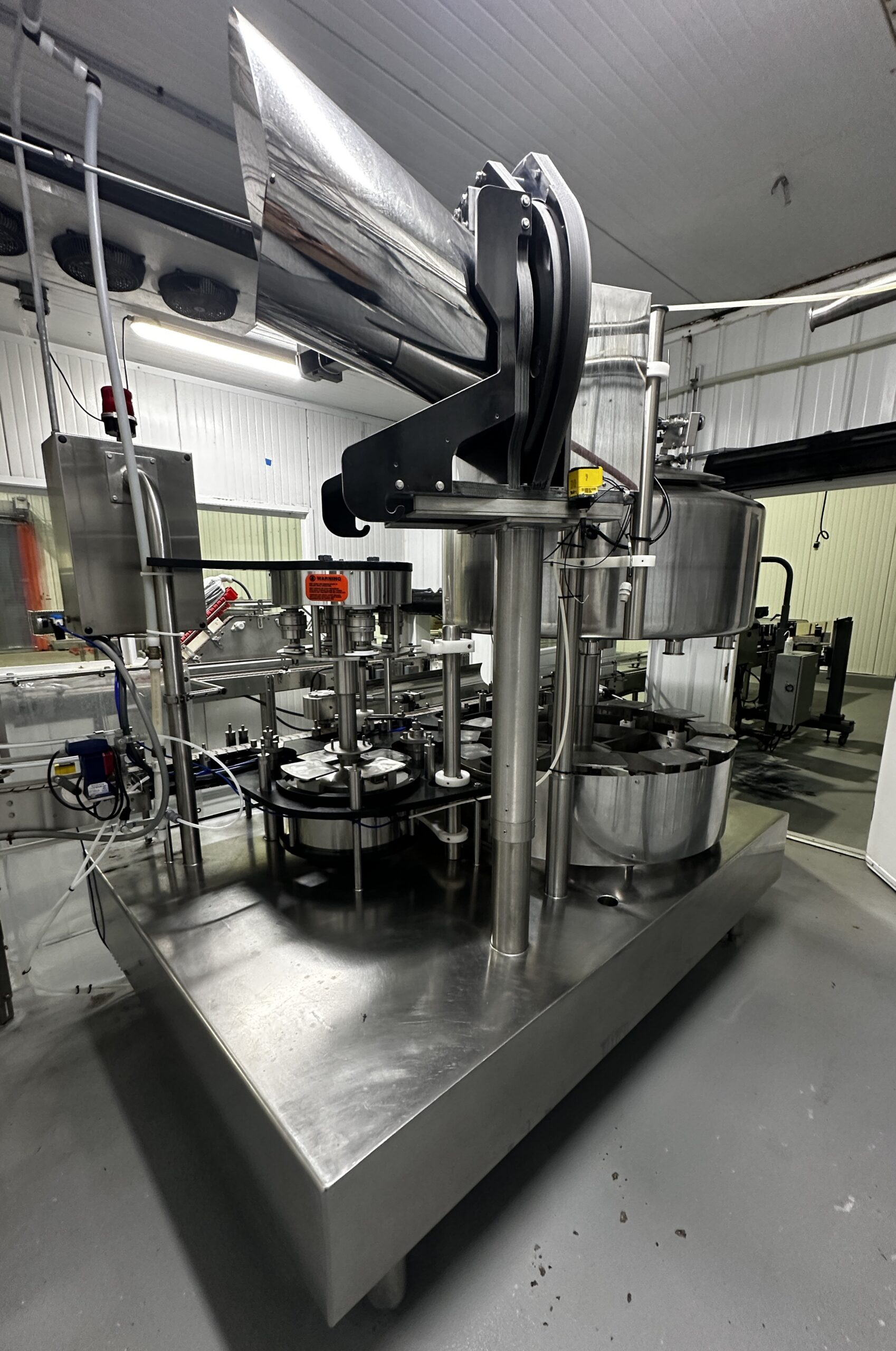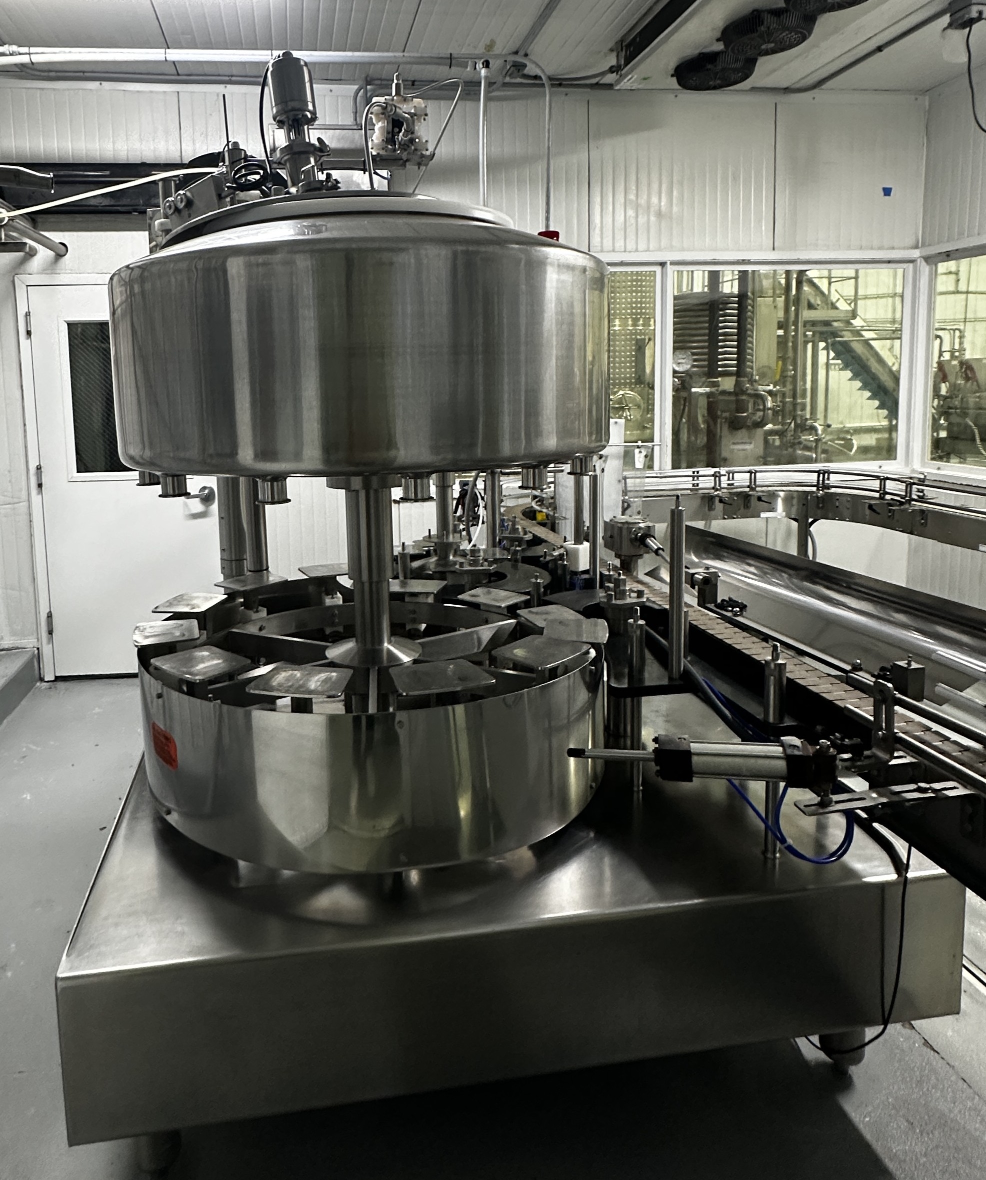 This combination machine was last used in a beverage facility. The 12-head filler filled large jugs of cider, followed by a 4-head capper.