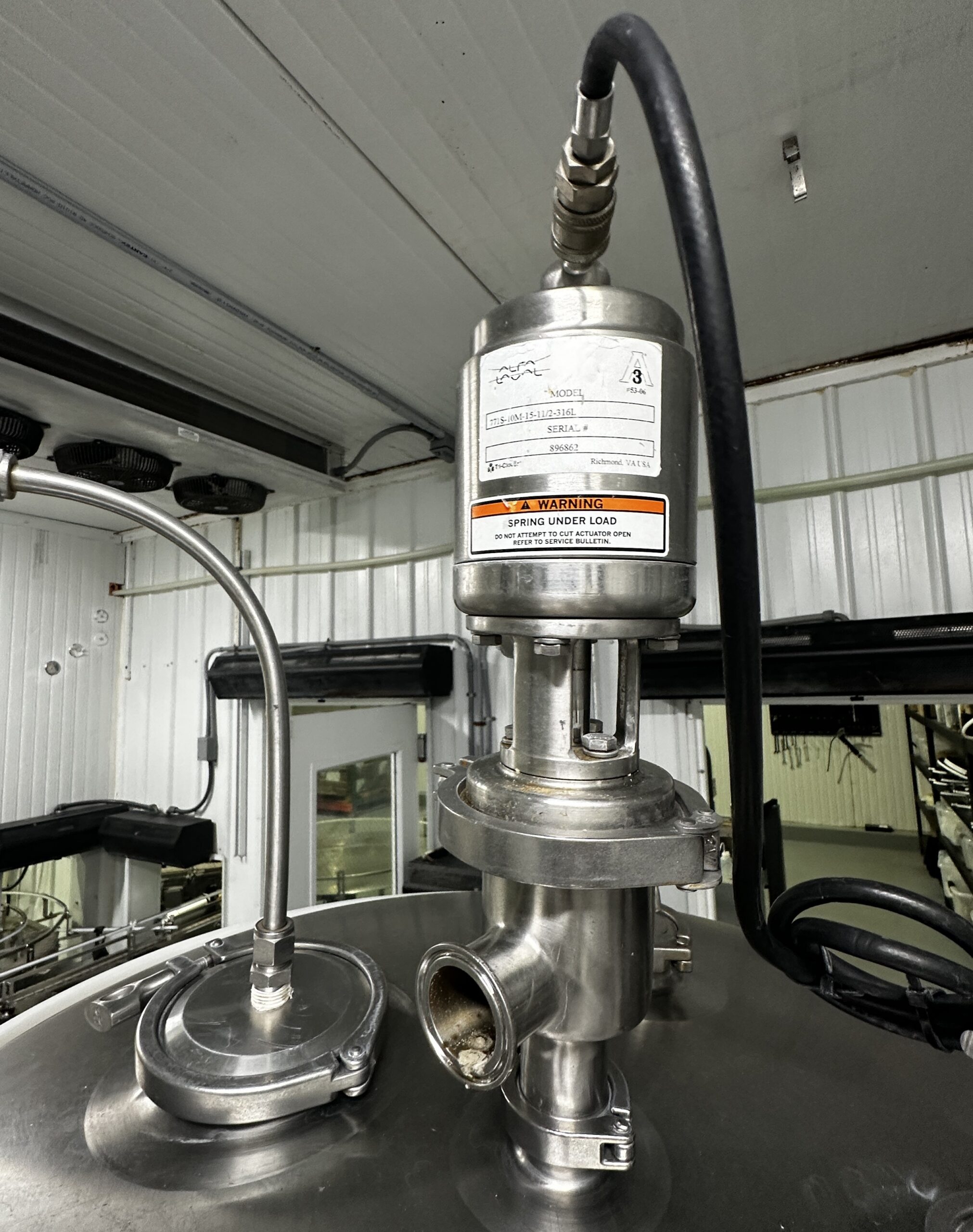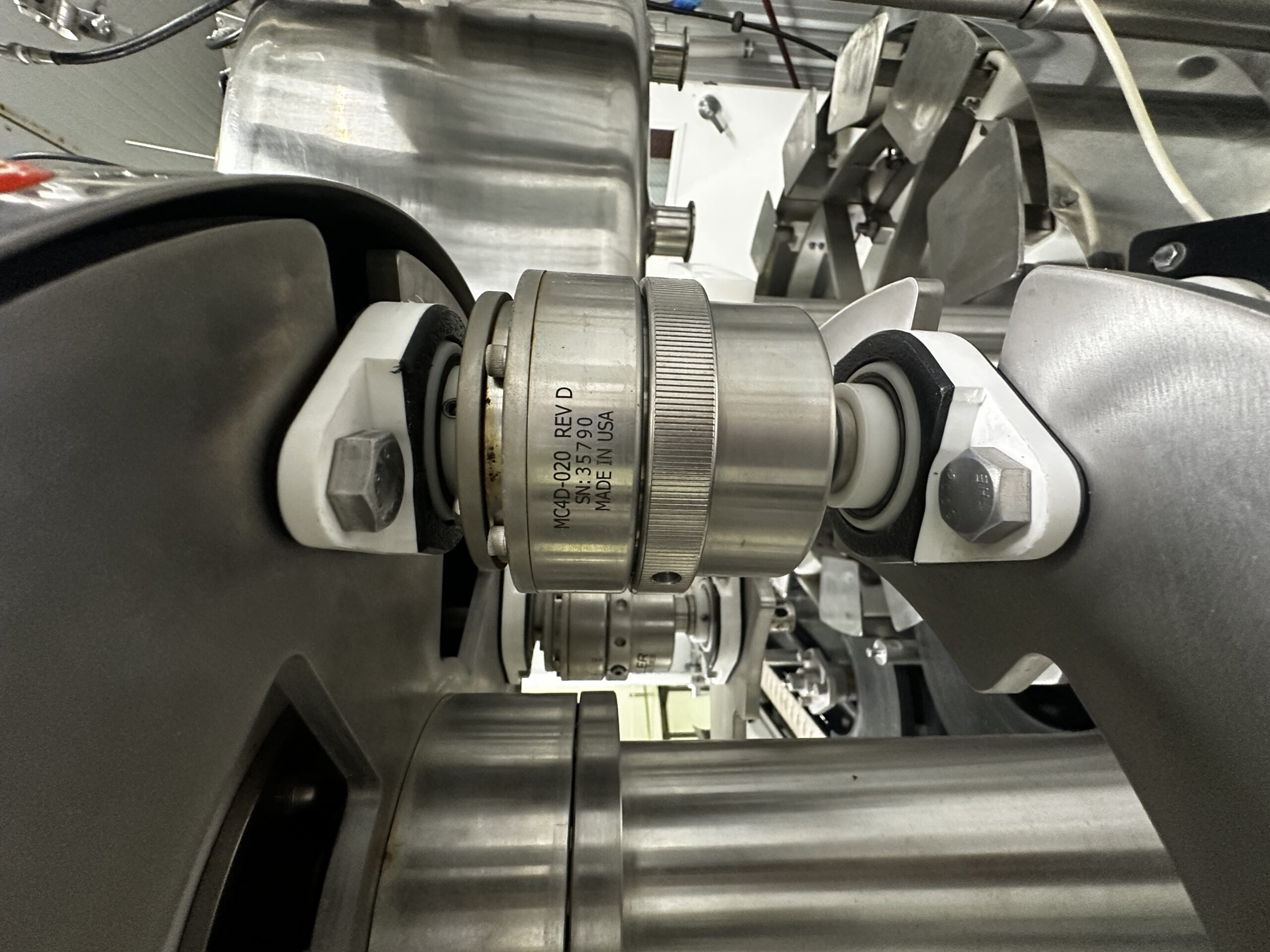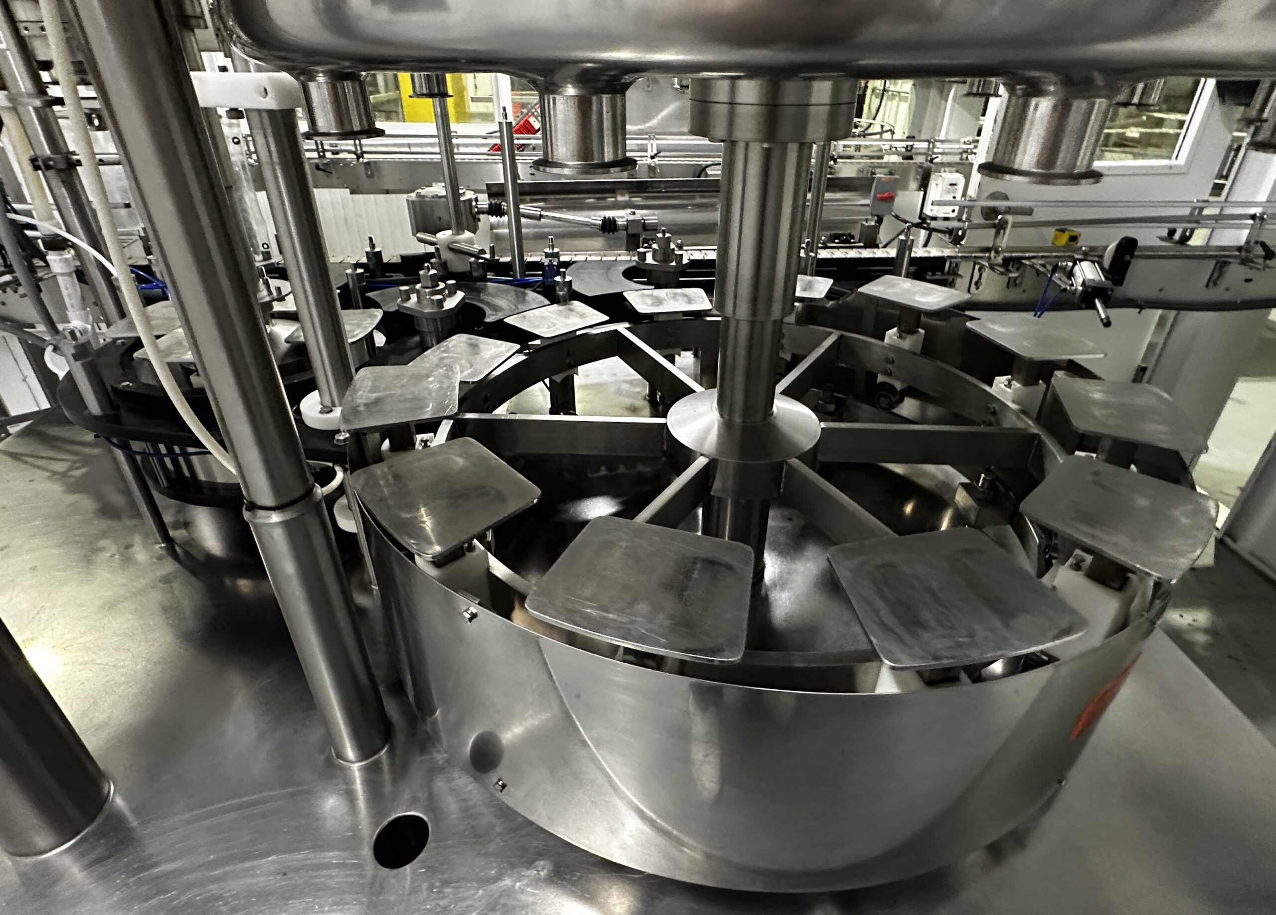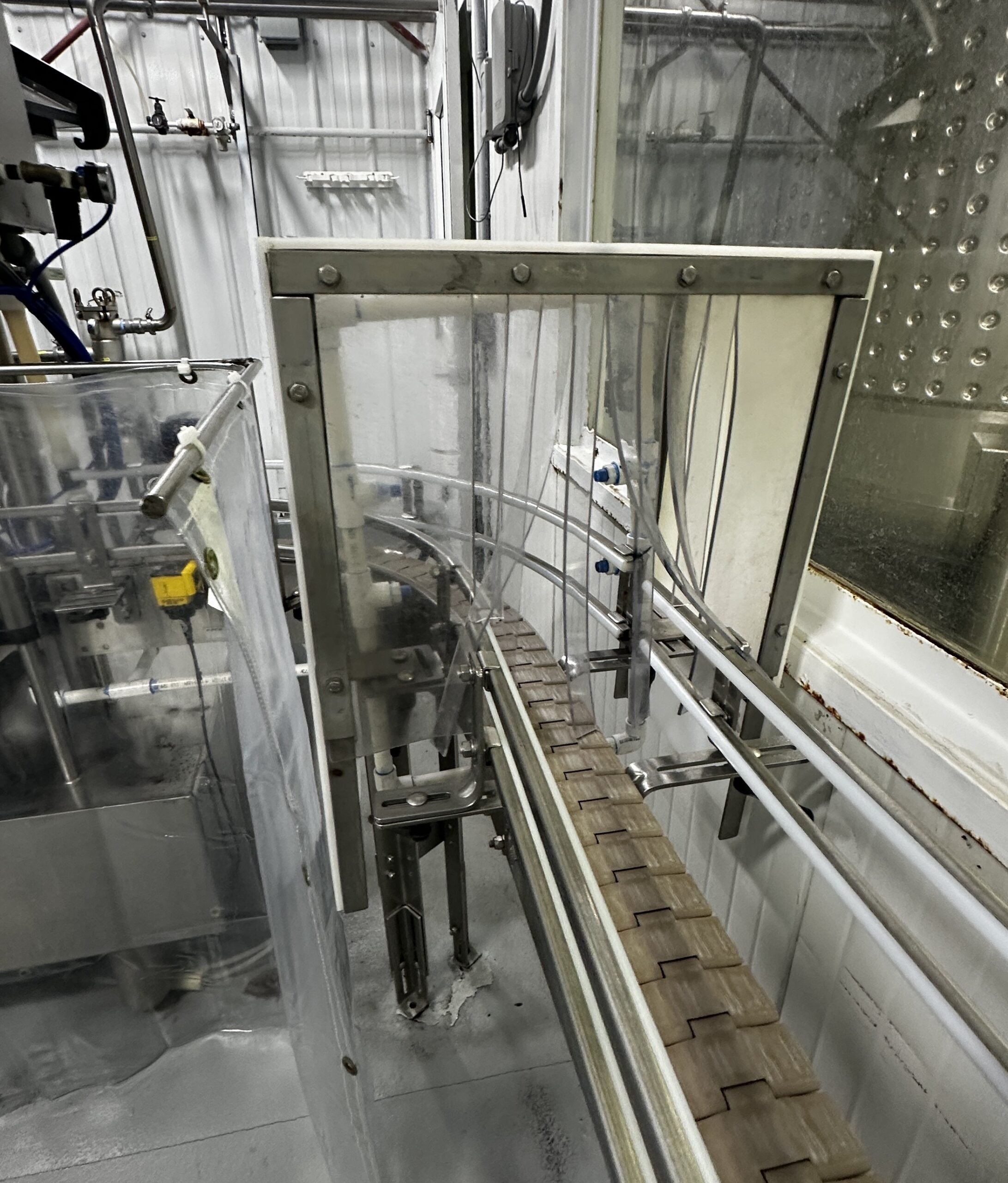 This combination machine was last used in a beverage facility. The 12-head filler filled large jugs of cider, followed by a 4-head capper.