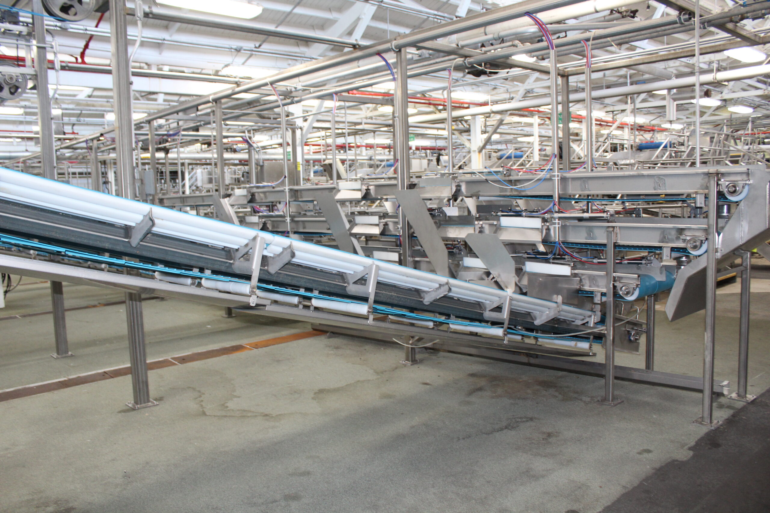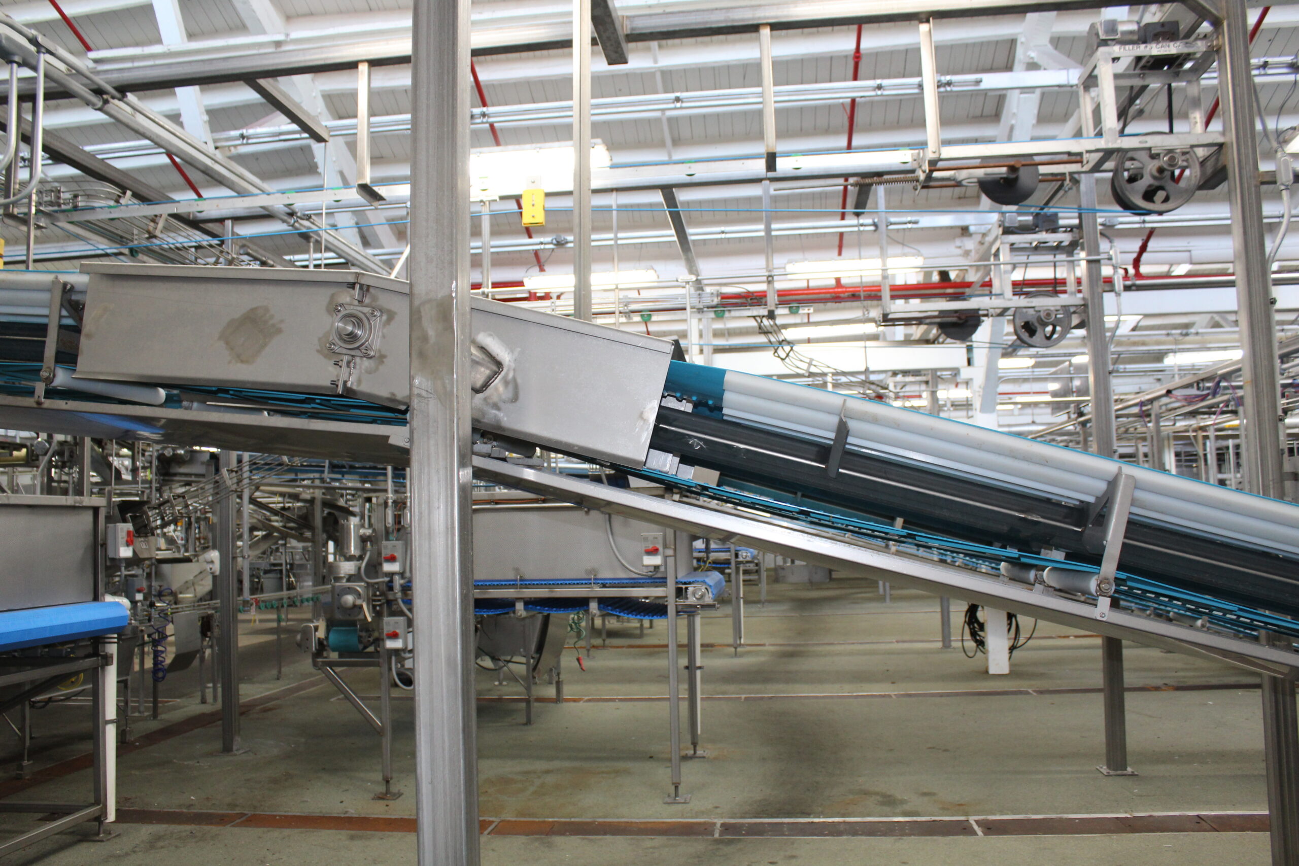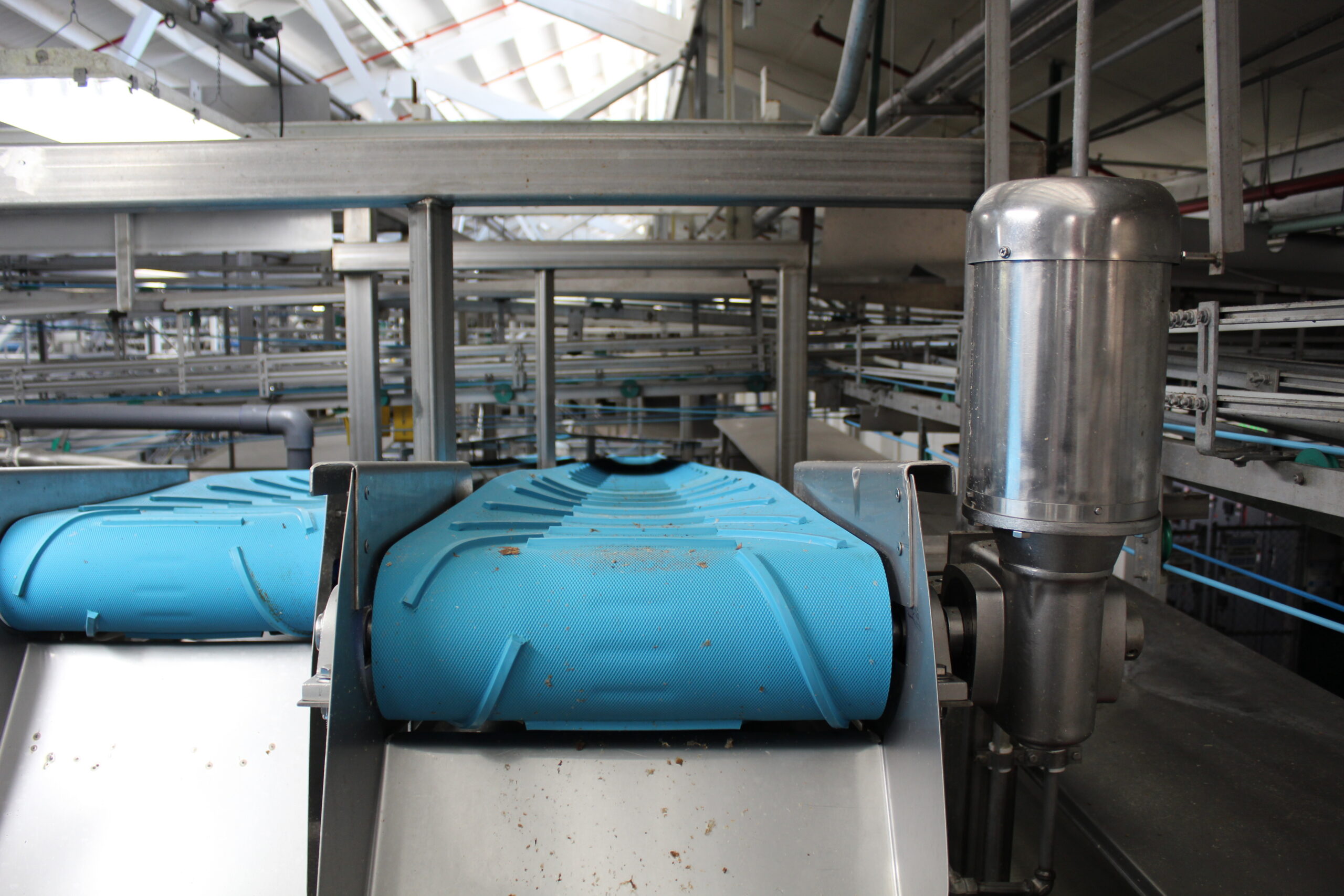 Single long conveyor belt that feeds into filler hopper. Out of all conveyors, this is the longest.