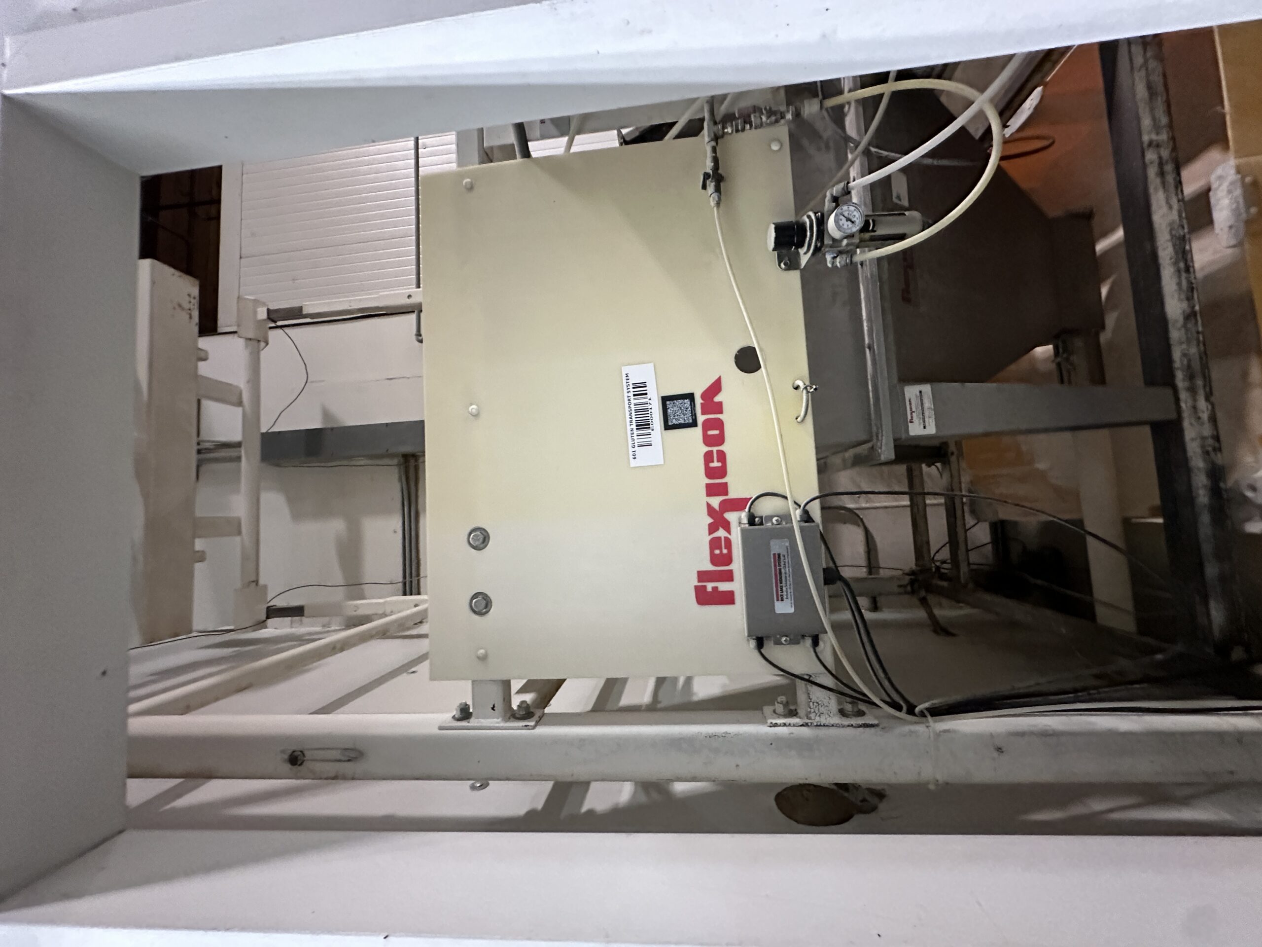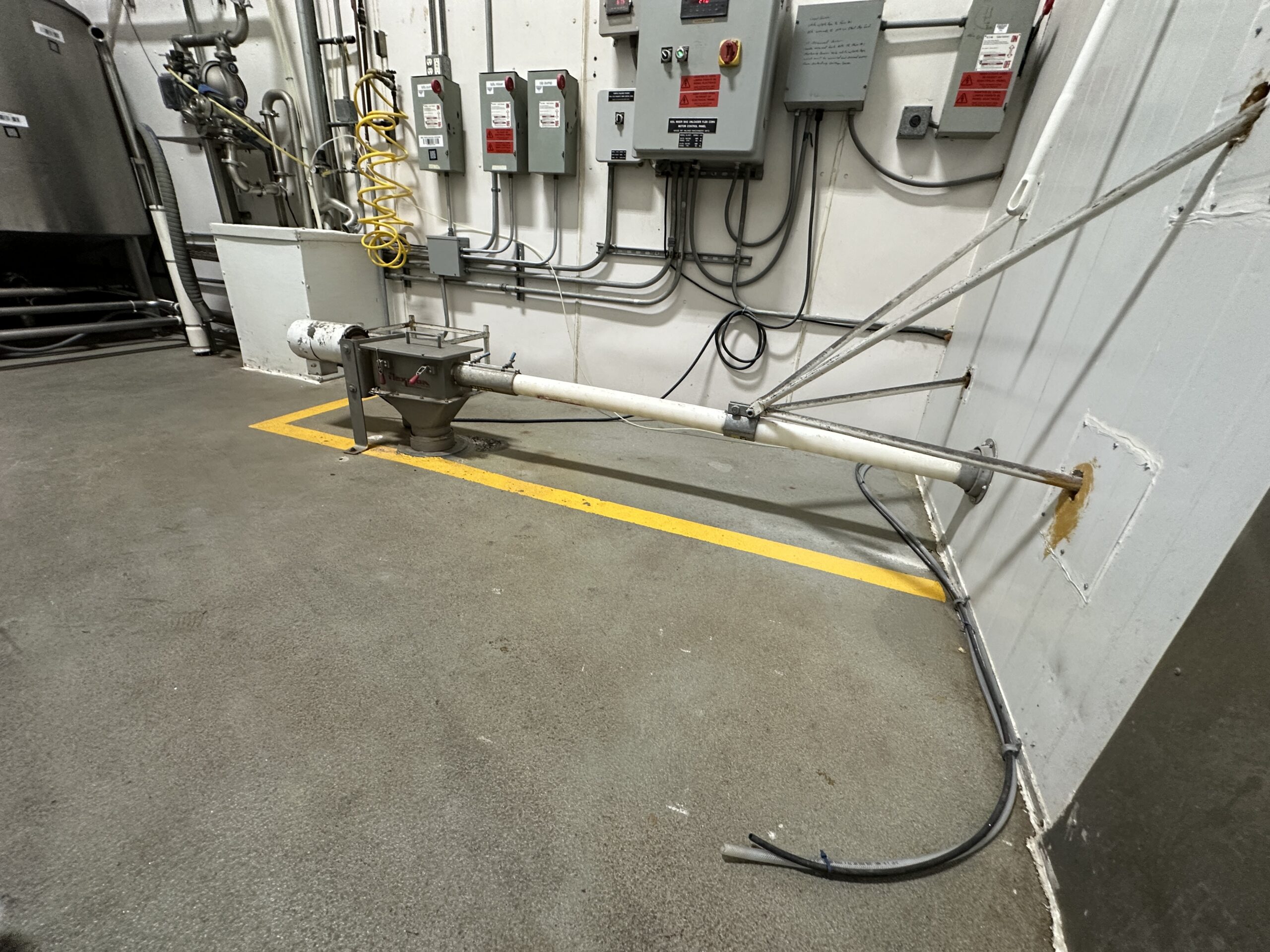 Used Flexicon Bulk-OUT BFF Bulk Bag Discharge (Super Sack) with a Flexicon Bulk receiving/manual dumping station with flexible screw auger conveyor. It was last used in a food processing plant, and is currently installed as shown.