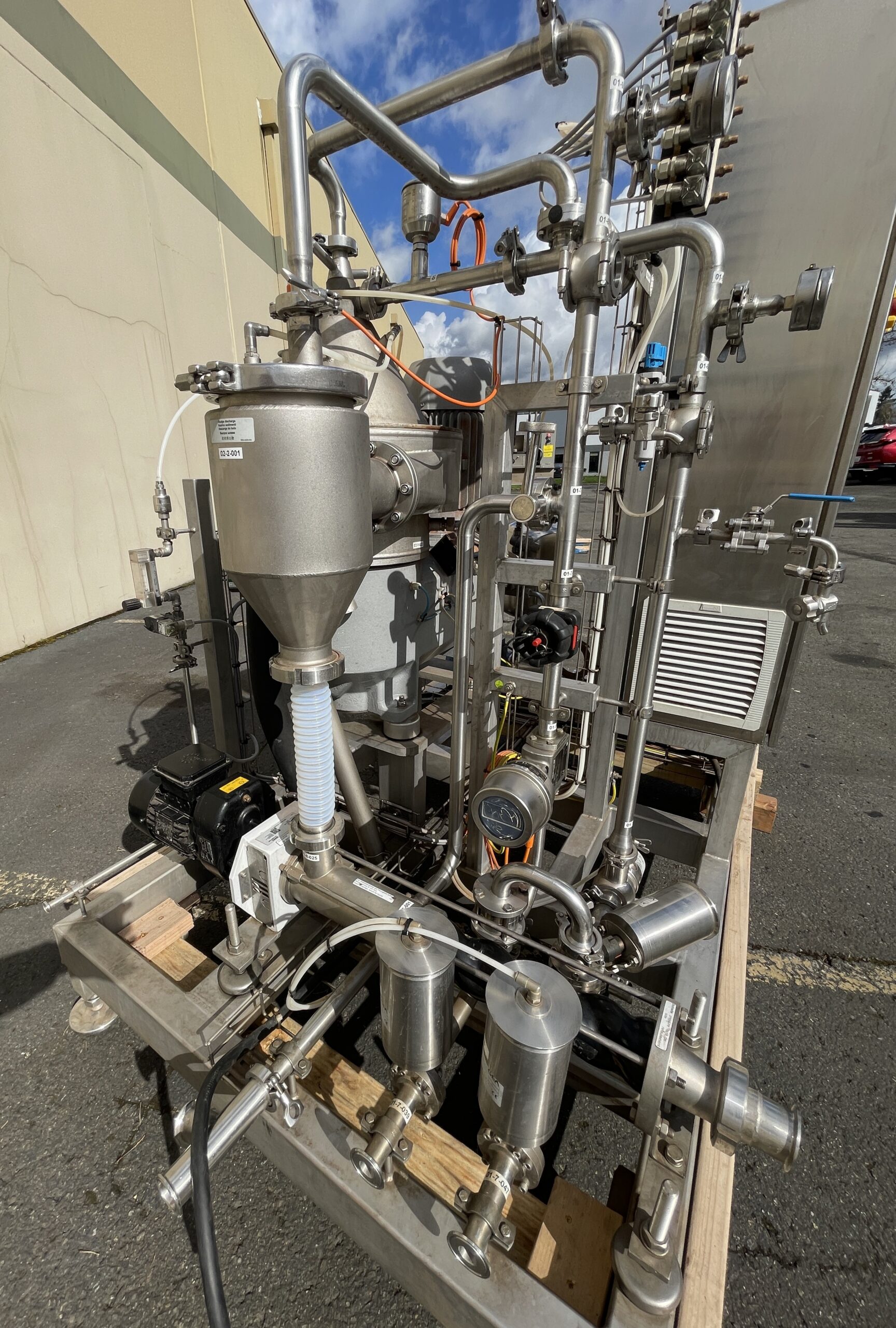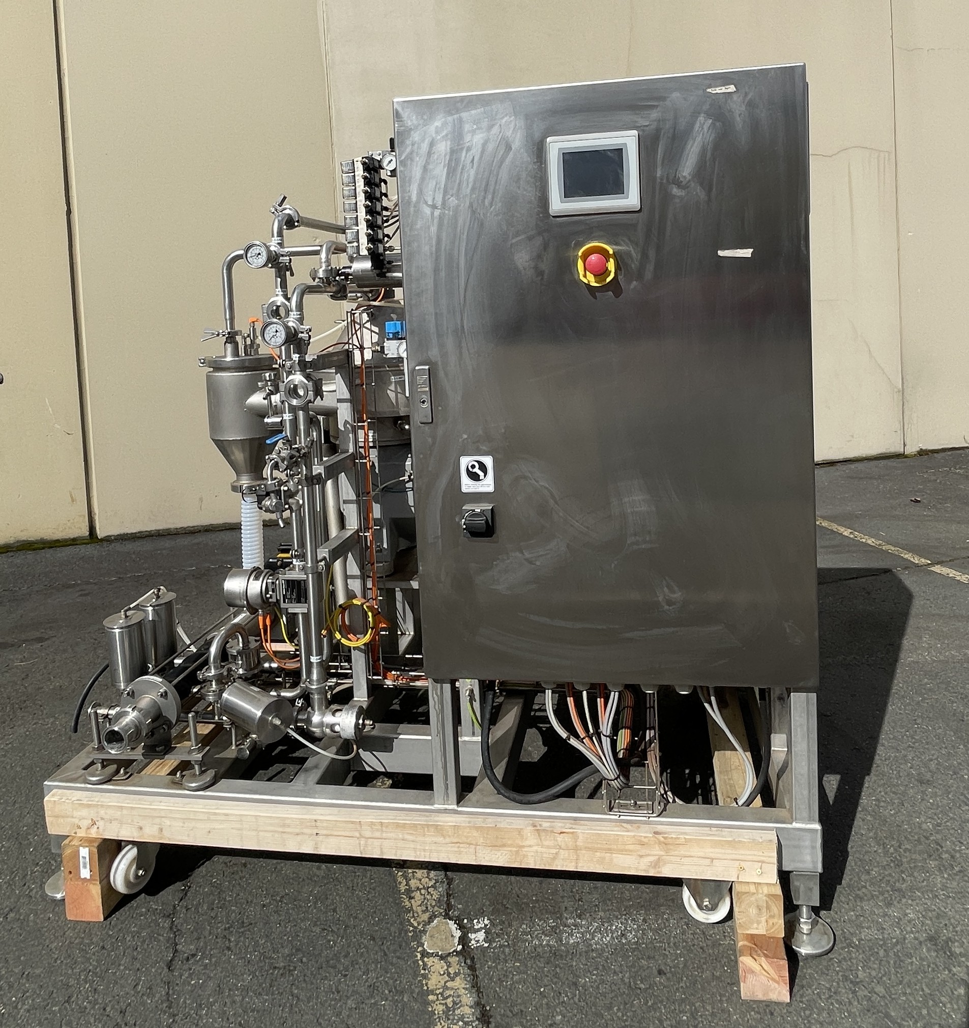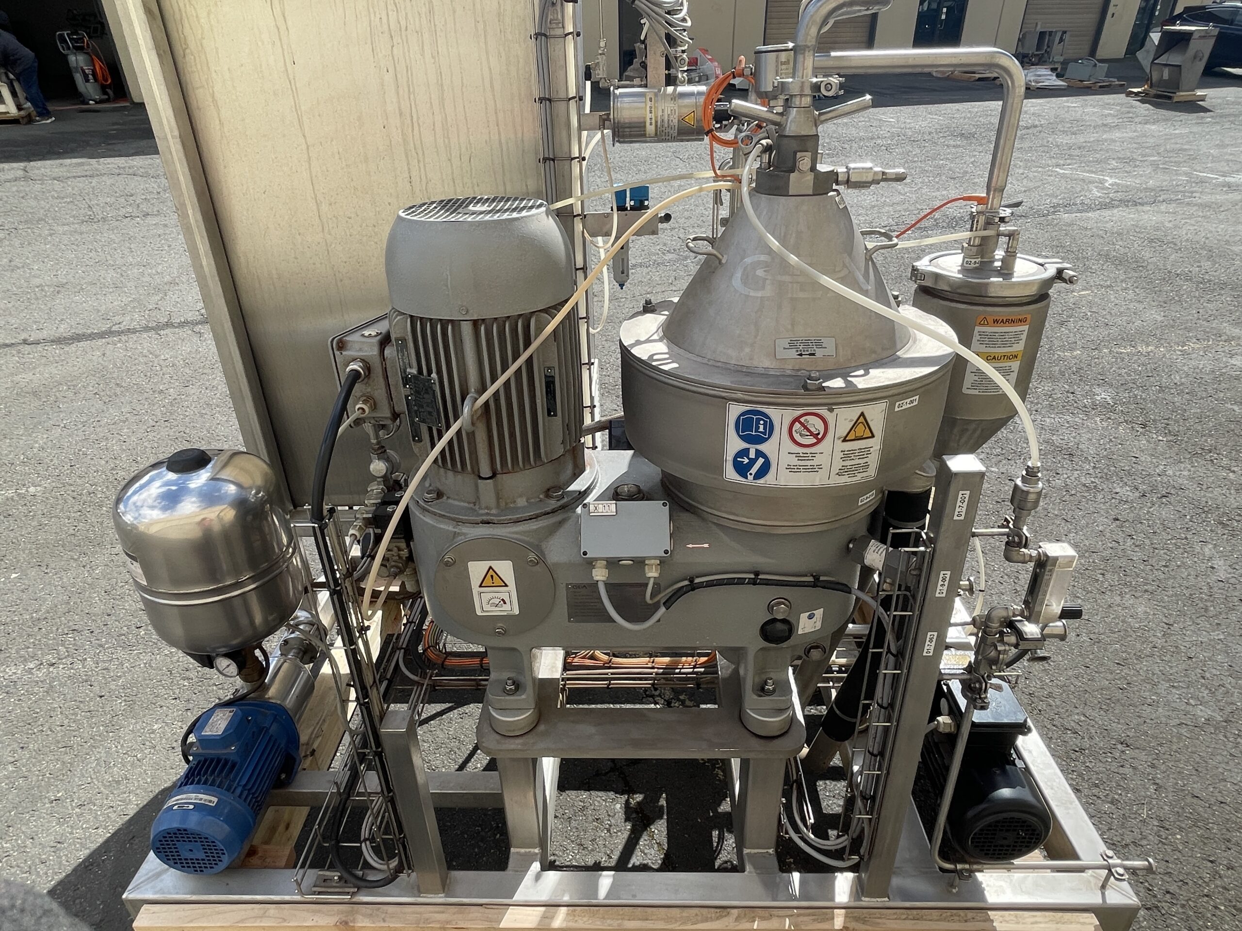 This separator uses centrifugal force to filter out fluids to varying degrees, and is typically used for processing beverages. It is currently on a pallet and has wheels for easy moving.