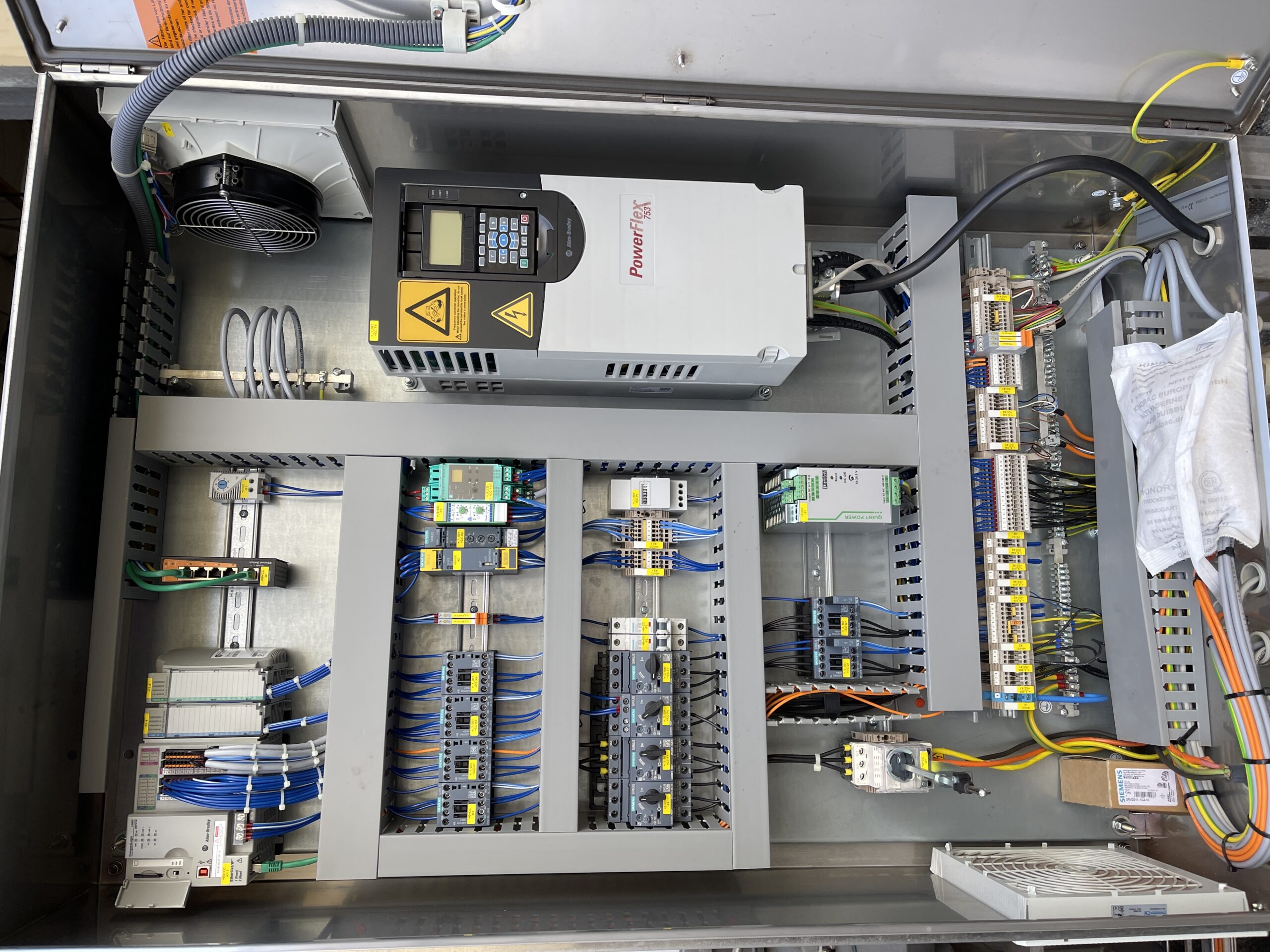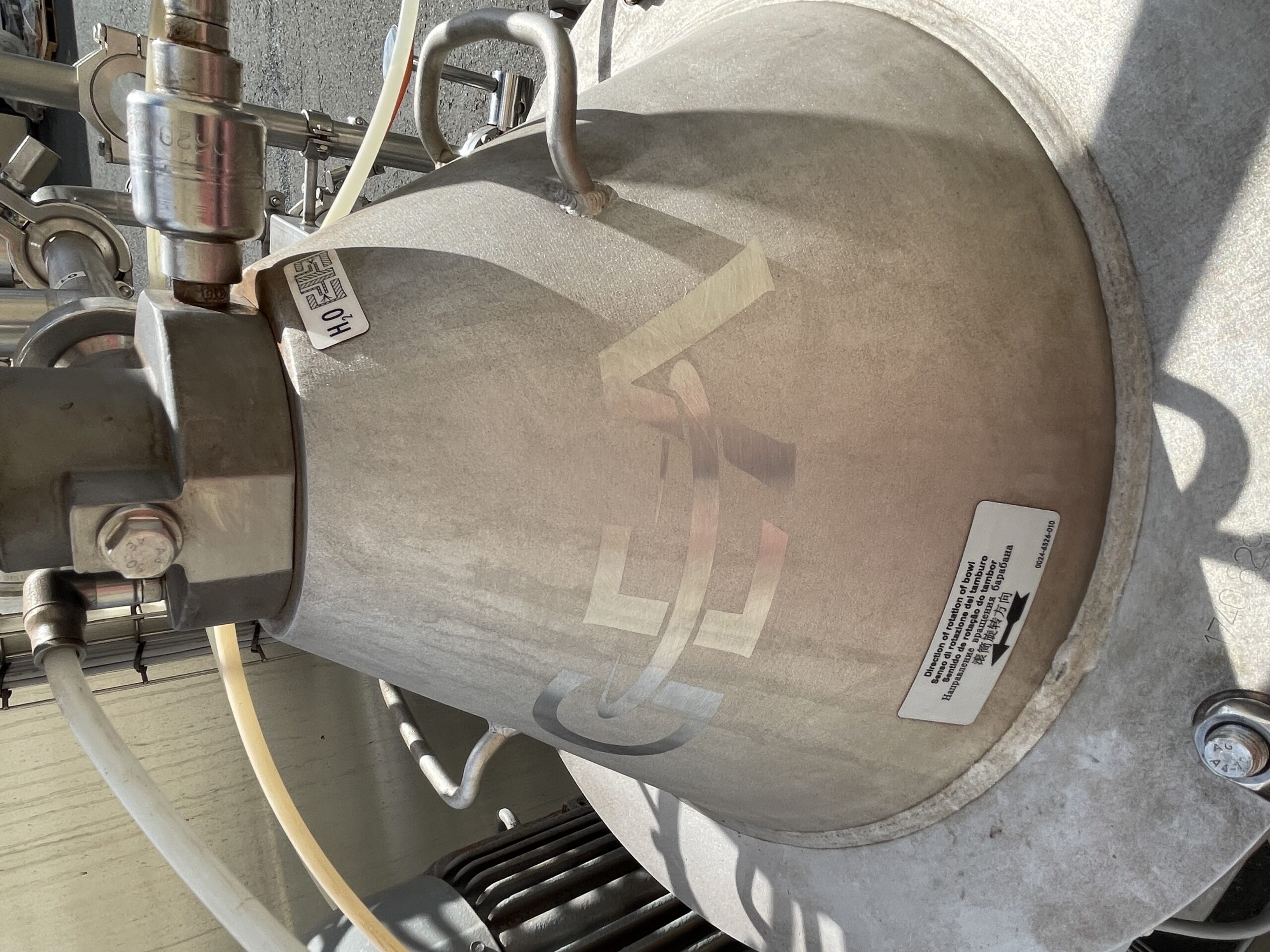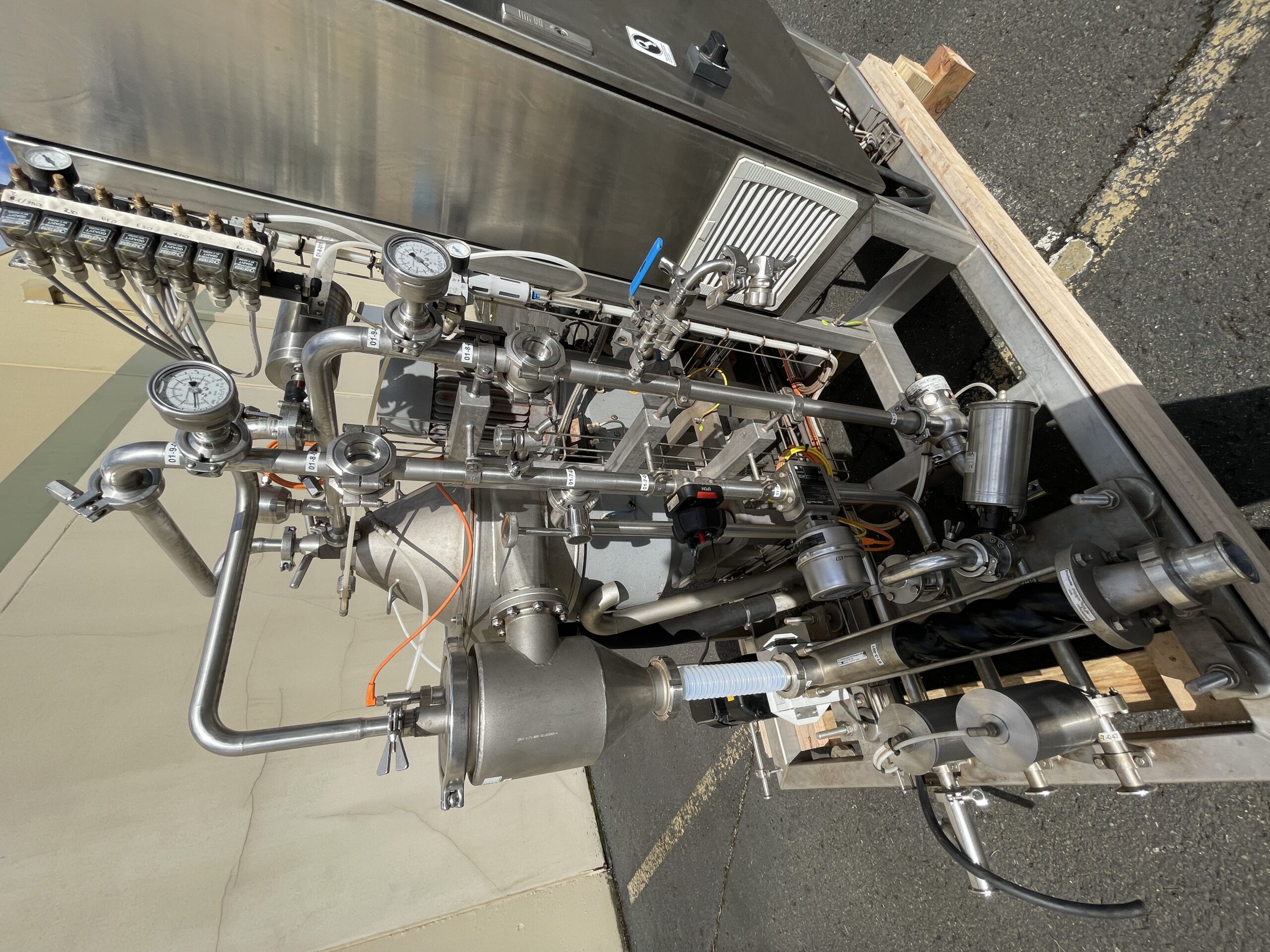 This separator uses centrifugal force to filter out fluids to varying degrees, and is typically used for processing beverages. It is currently on a pallet and has wheels for easy moving.