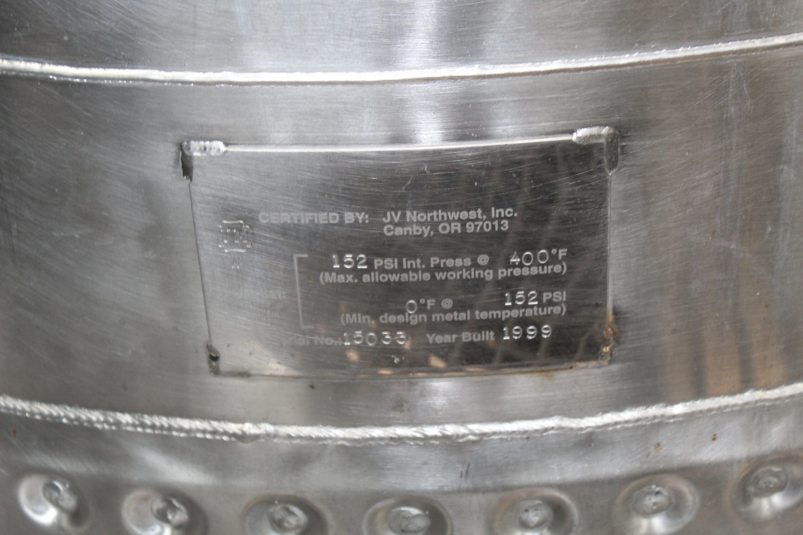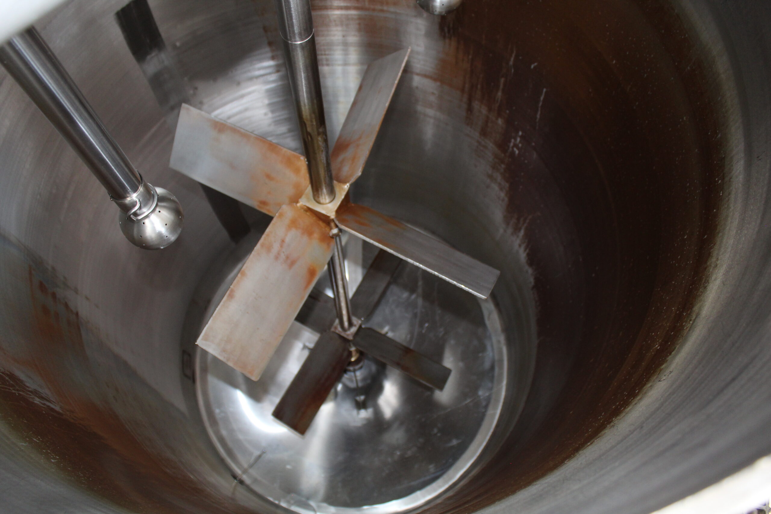 Jacketed feed tank. Includes two spray balls and two propellor agitators on single shaft