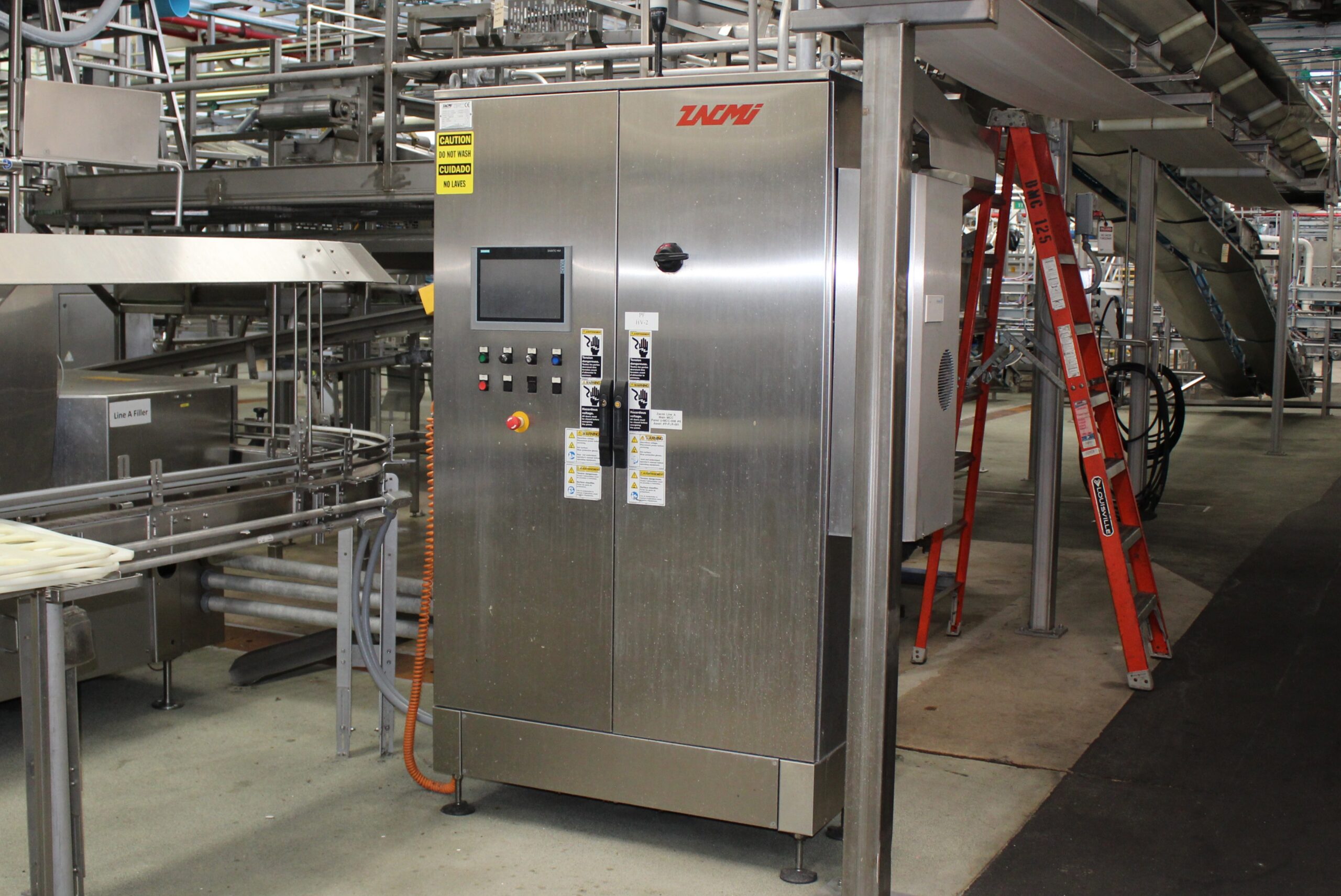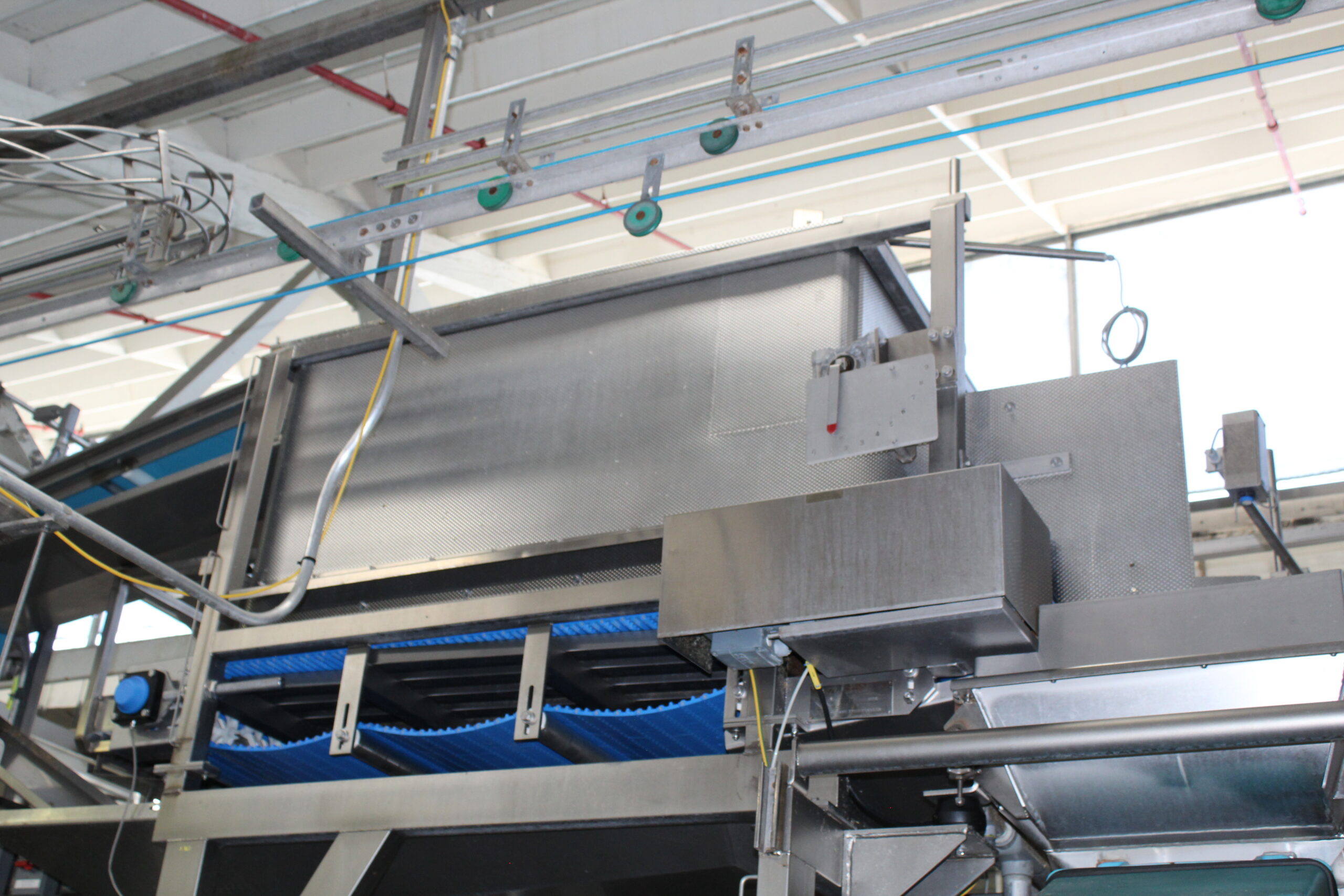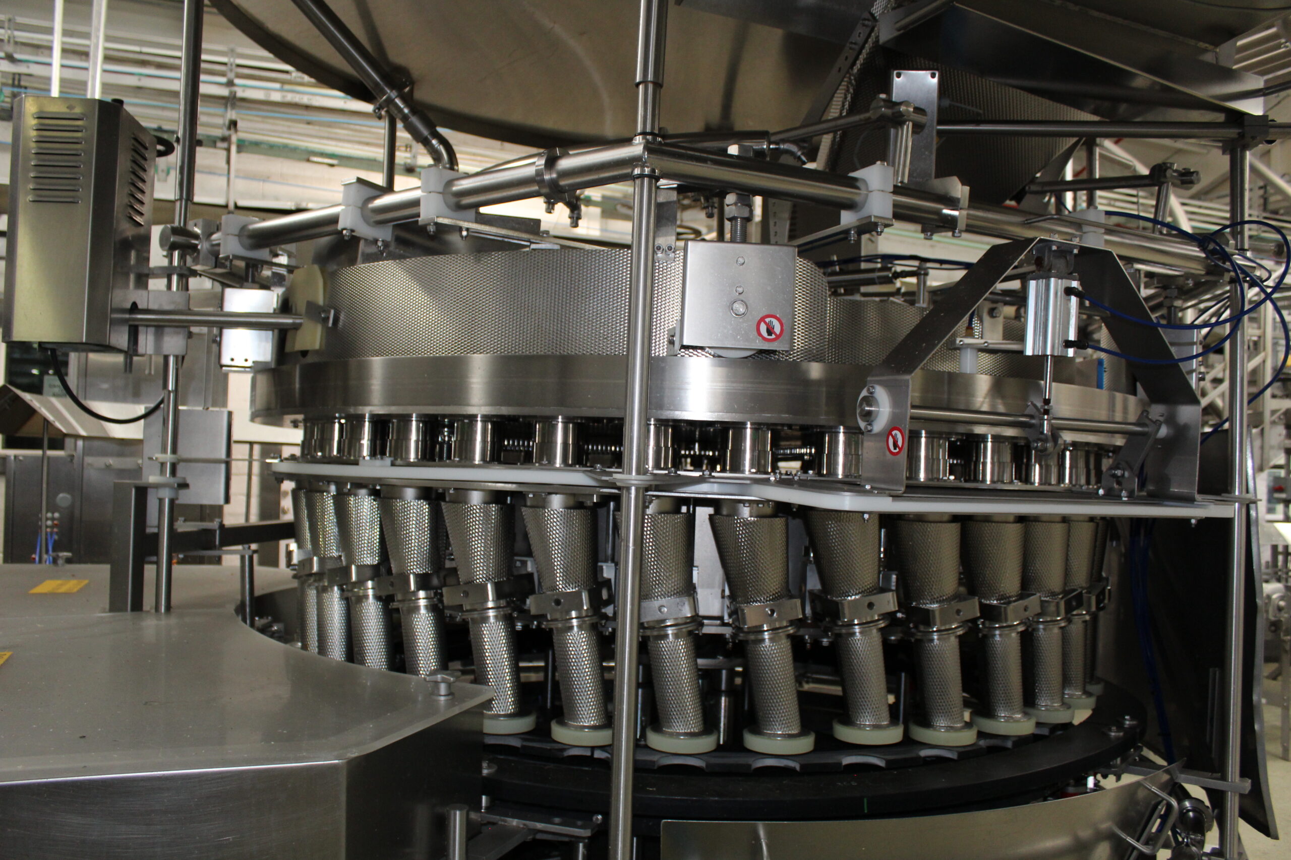 This hopper feeds product into the filler at a metered rate. The 36 pocket filler is made by Zacmi.