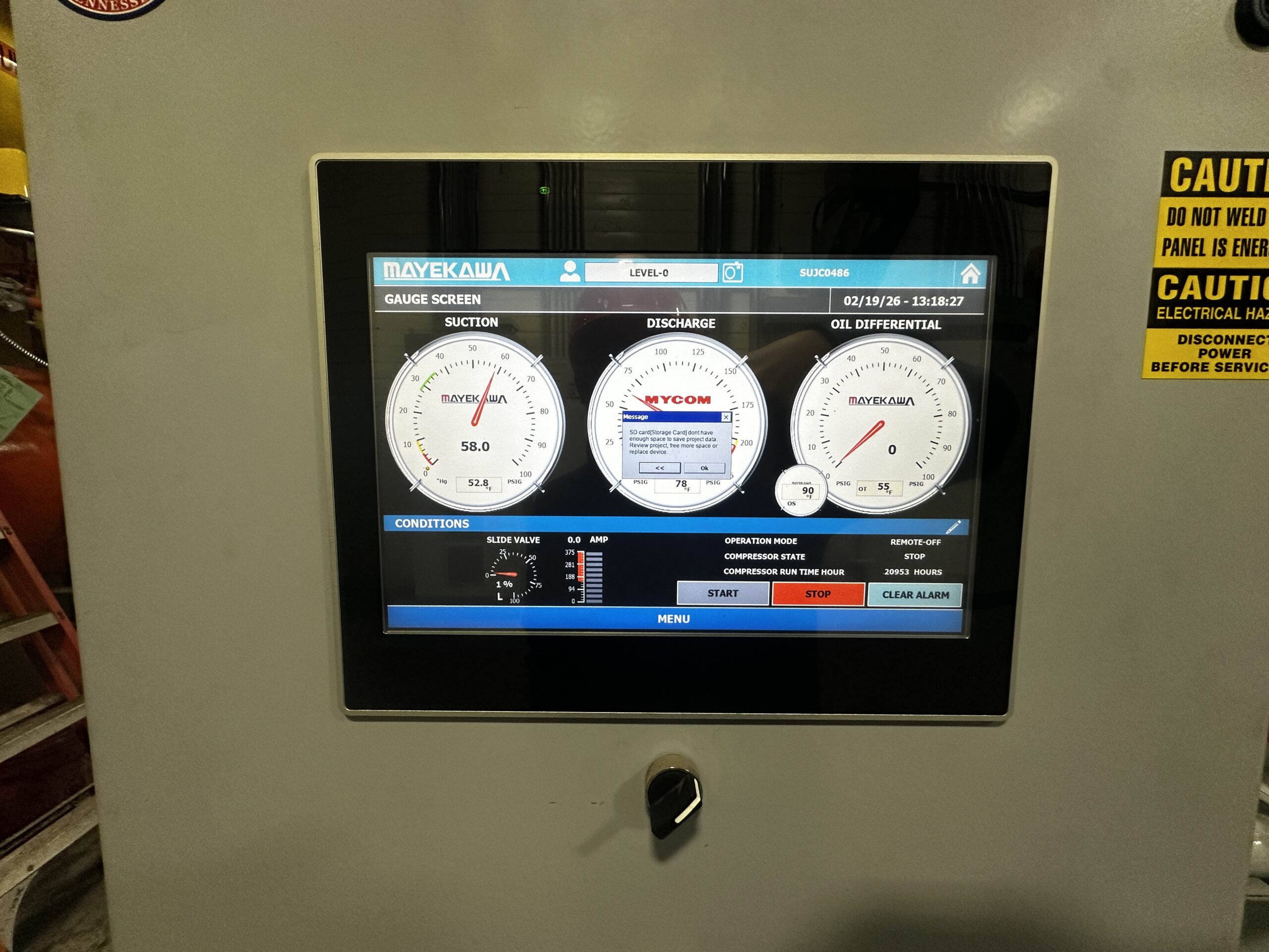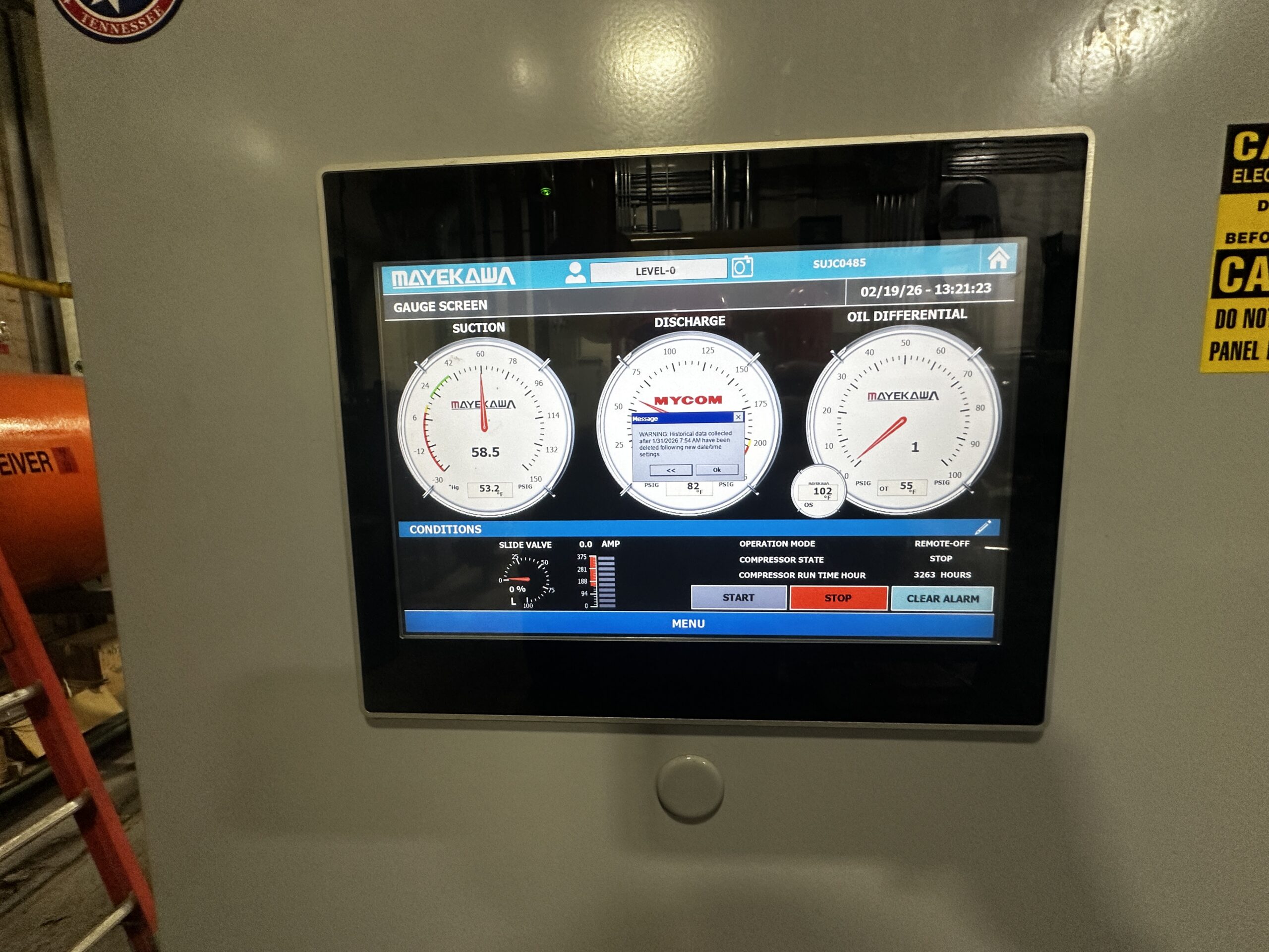 Two (2) 2020 Mycom Mayekawa 125 HP J series Screw Ammonia Compressors with MYPOR Touch Plus MTP111-120 and Ammonia receiving system. Details of each compressor below.