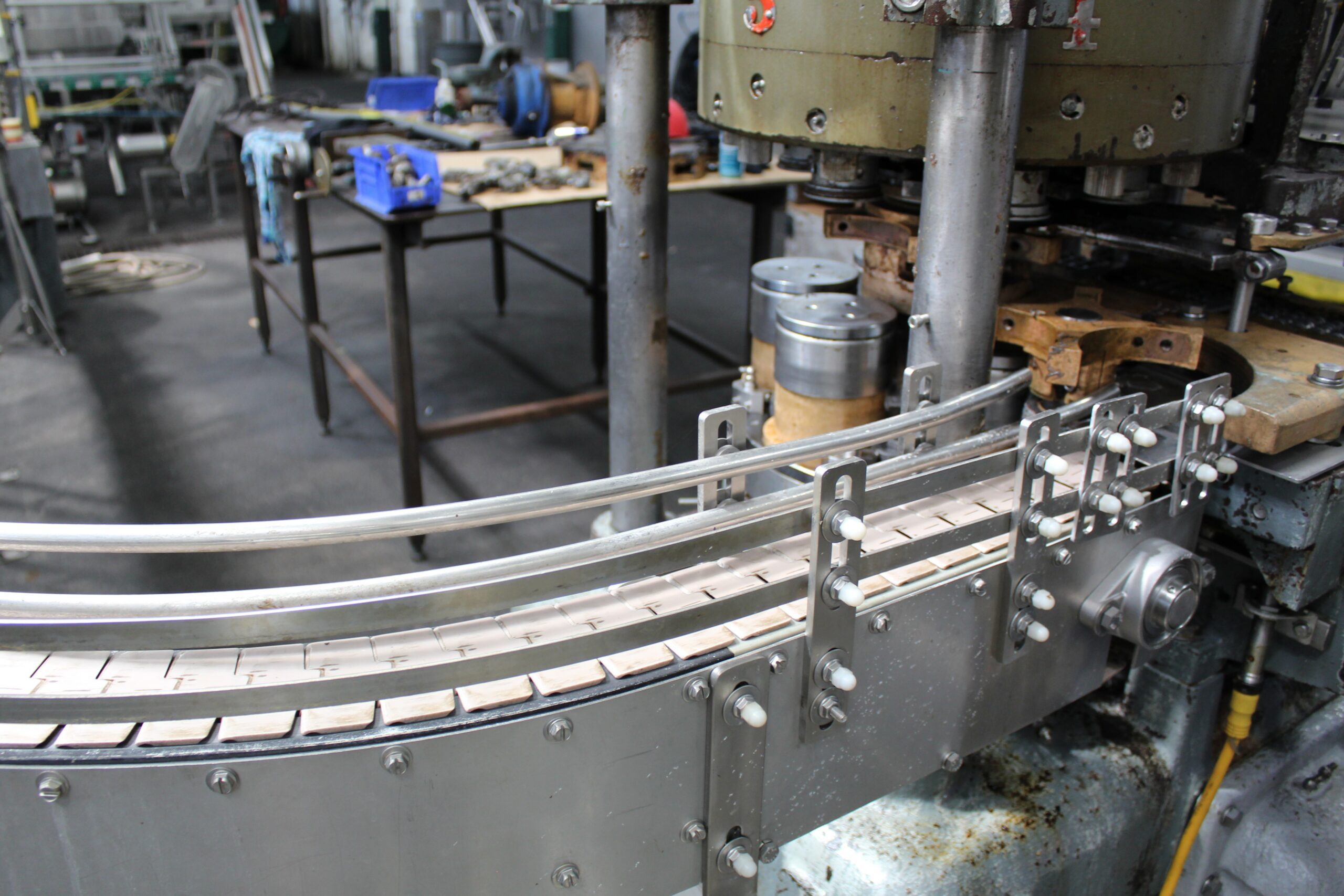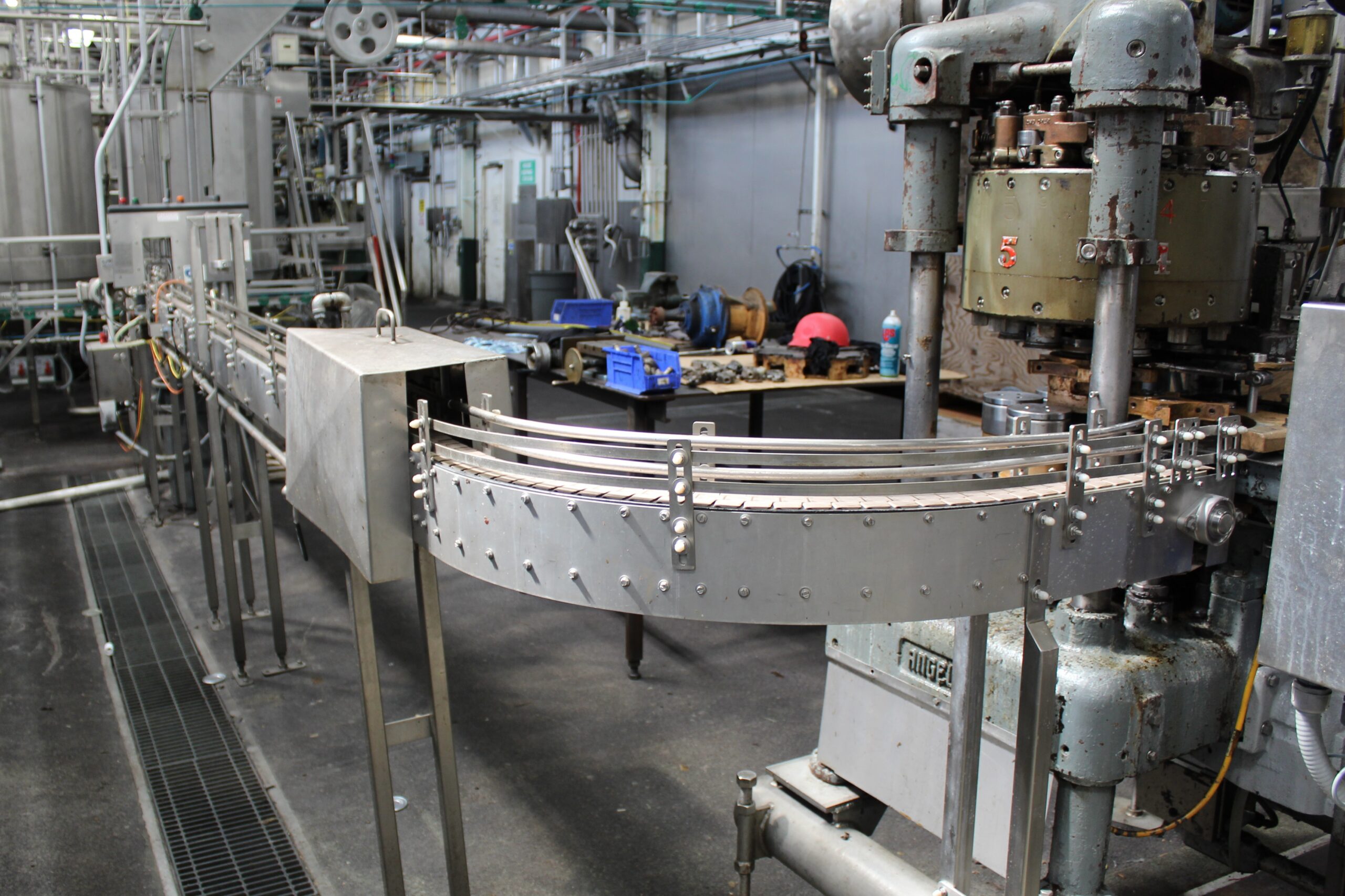 Outfeed of seamer conveyor with a 45 degree turn. Approximately 19′ of stright section of tabel top conveyor.
