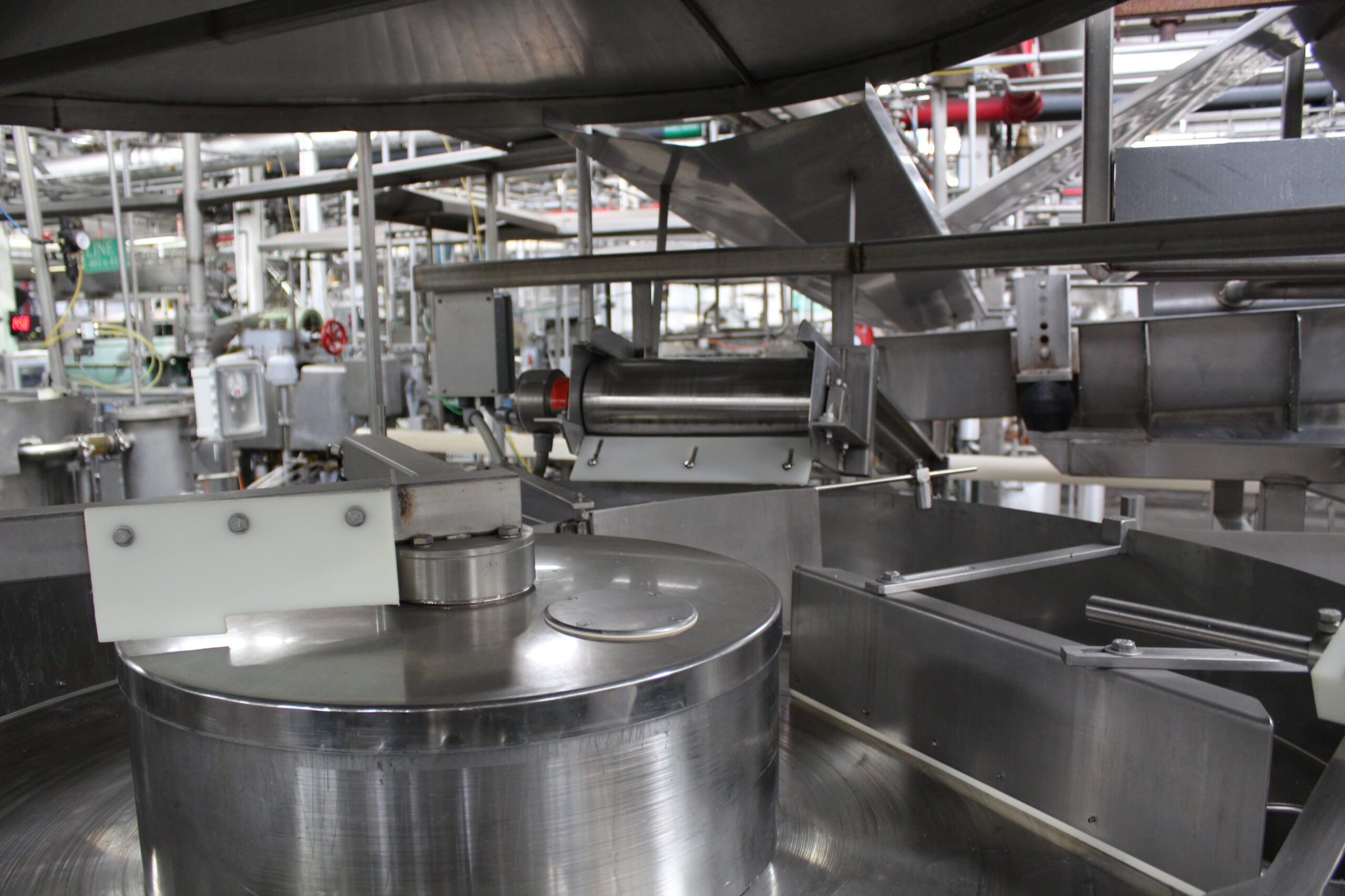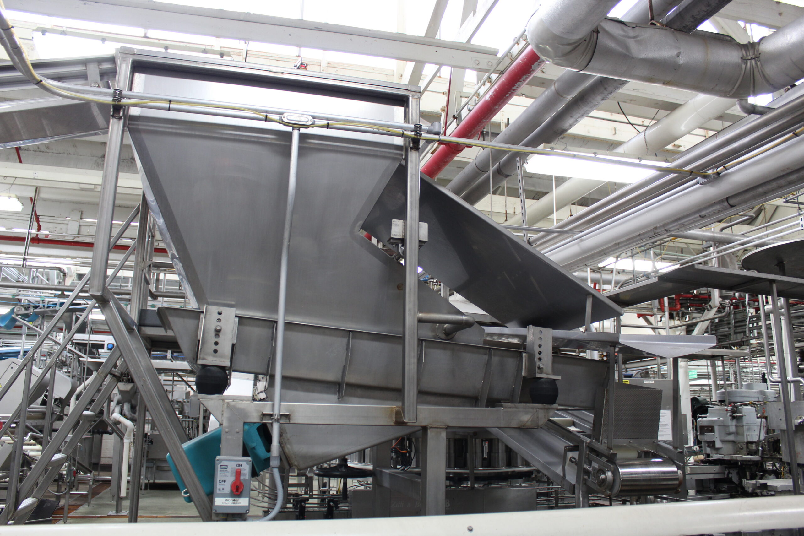 ZB hopper shaker, infeed conveyor into pocket filler. The filler is set to run 603×700 or #10 sized cans.